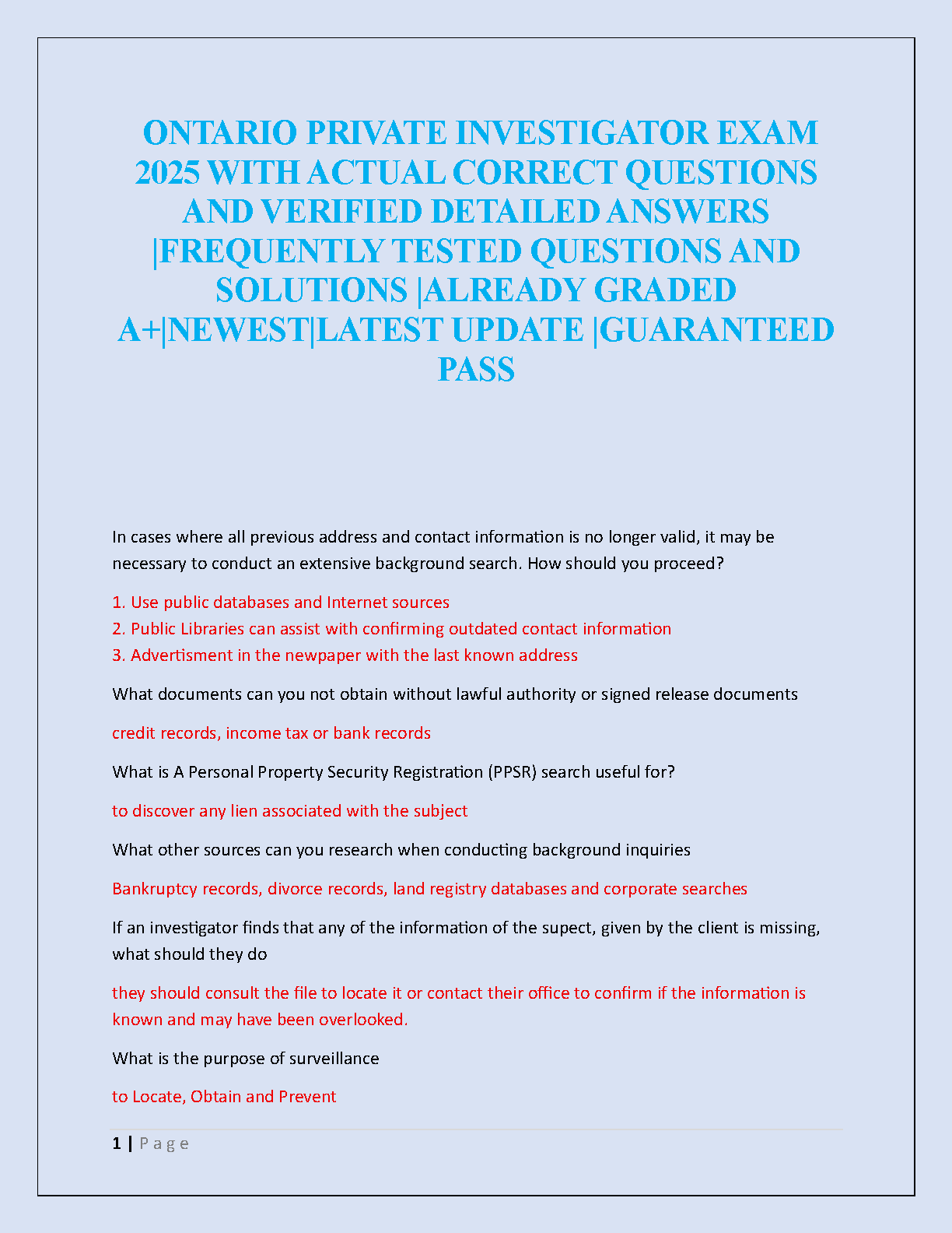 Ace your Ontario Private Investigator licensure test with our premier Test Bank, updated for the 2025/2026 academic year. This comprehensive study guide is meticulously designed to help you pass on your first attempt, eliminating the need for costly resits. It features an extensive collection of actual exam questions with verified, detailed answers and solutions. Achieve an A+ grade and confidently step into your career with this essential preparation tool, covering all frequently tested topics for a guaranteed pass.