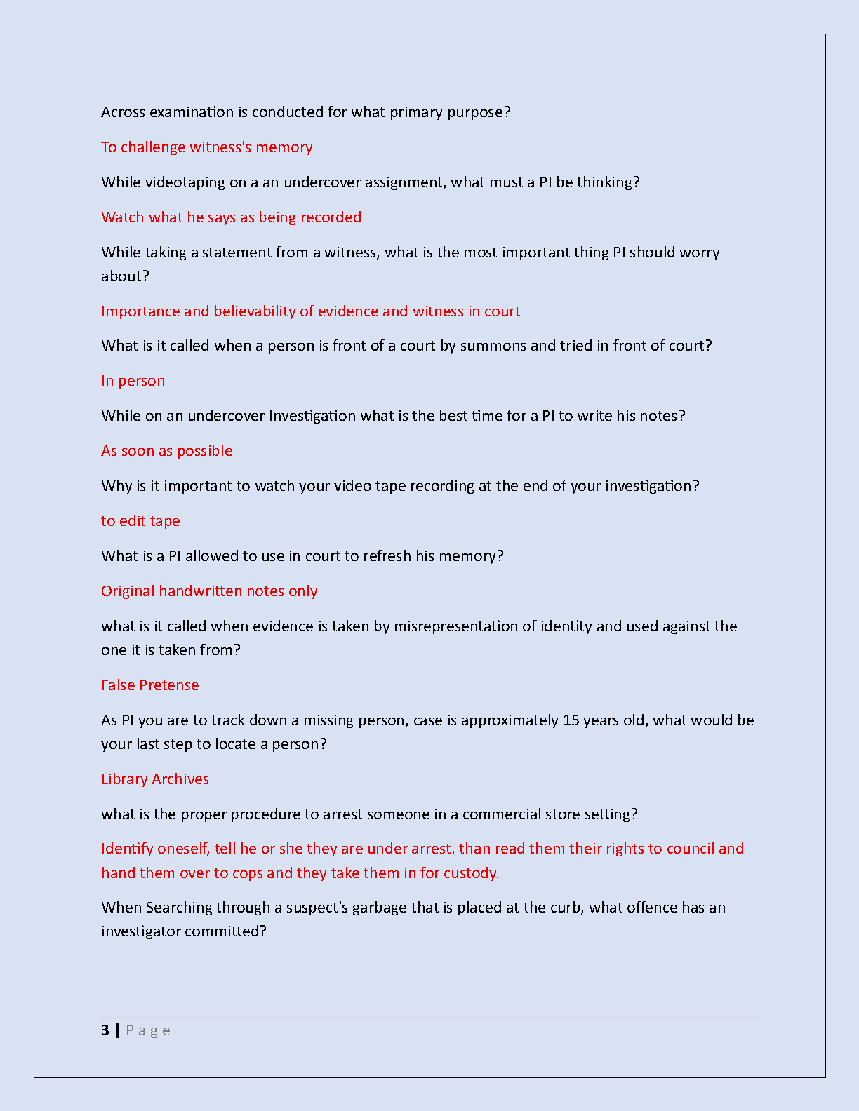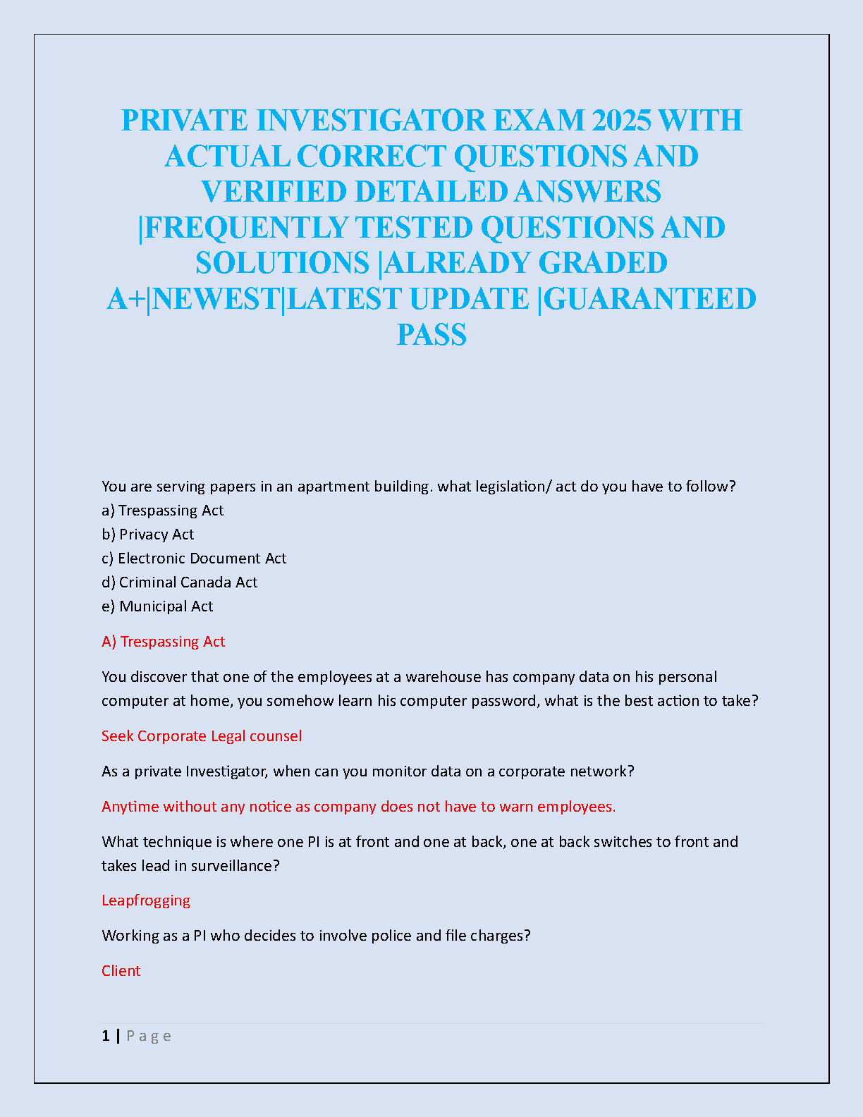 Ace your 2025 Private Investigator certification with our latest, A+ graded test bank. This comprehensive study guide is packed with actual exam questions and verified, detailed answers, covering all the essential topics you need to know. Master frequently tested concepts and scenarios, from legal procedures like the Trespassing Act to surveillance techniques. This resource is designed to provide you with the confidence and knowledge needed to pass your PI exam on the first attempt. Get the latest update and guarantee your success!