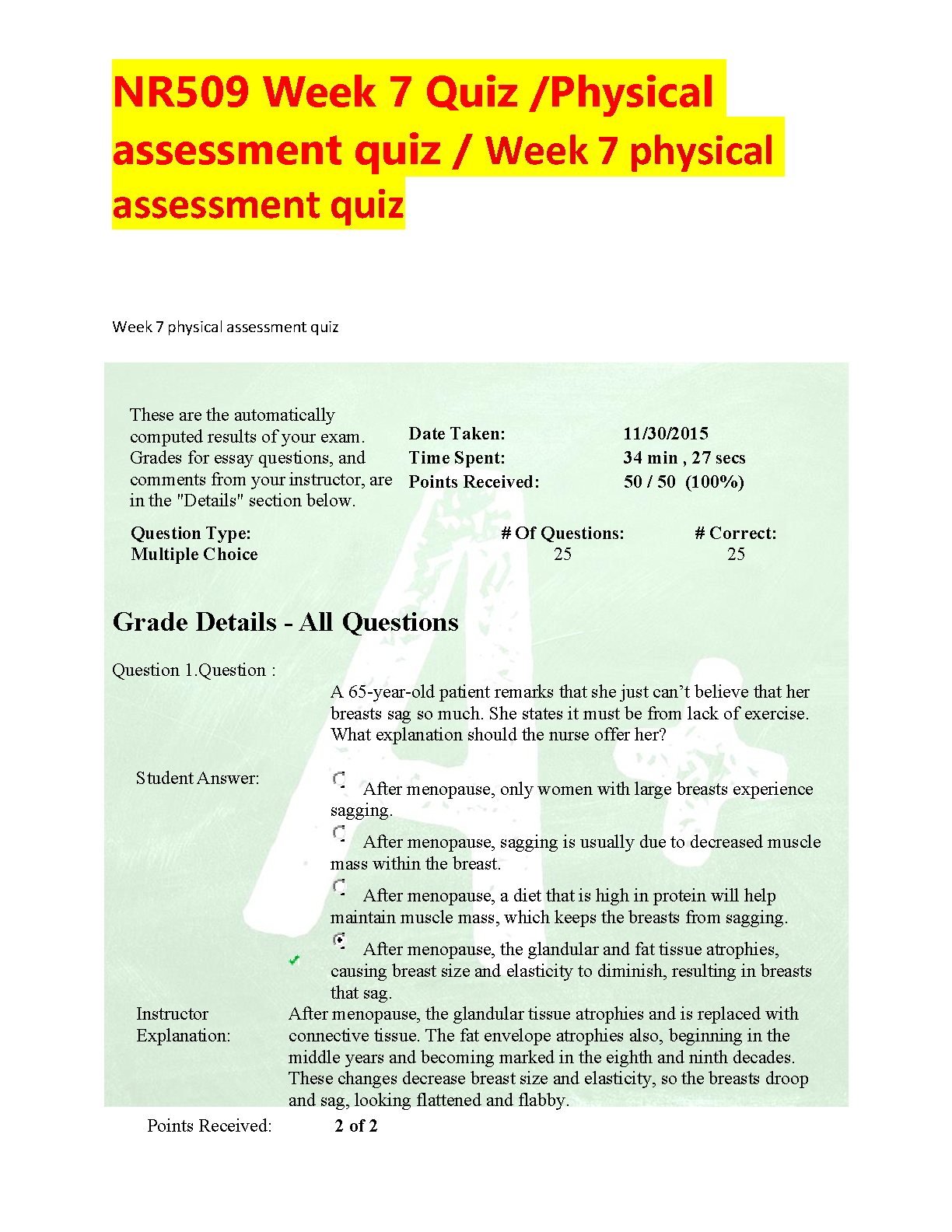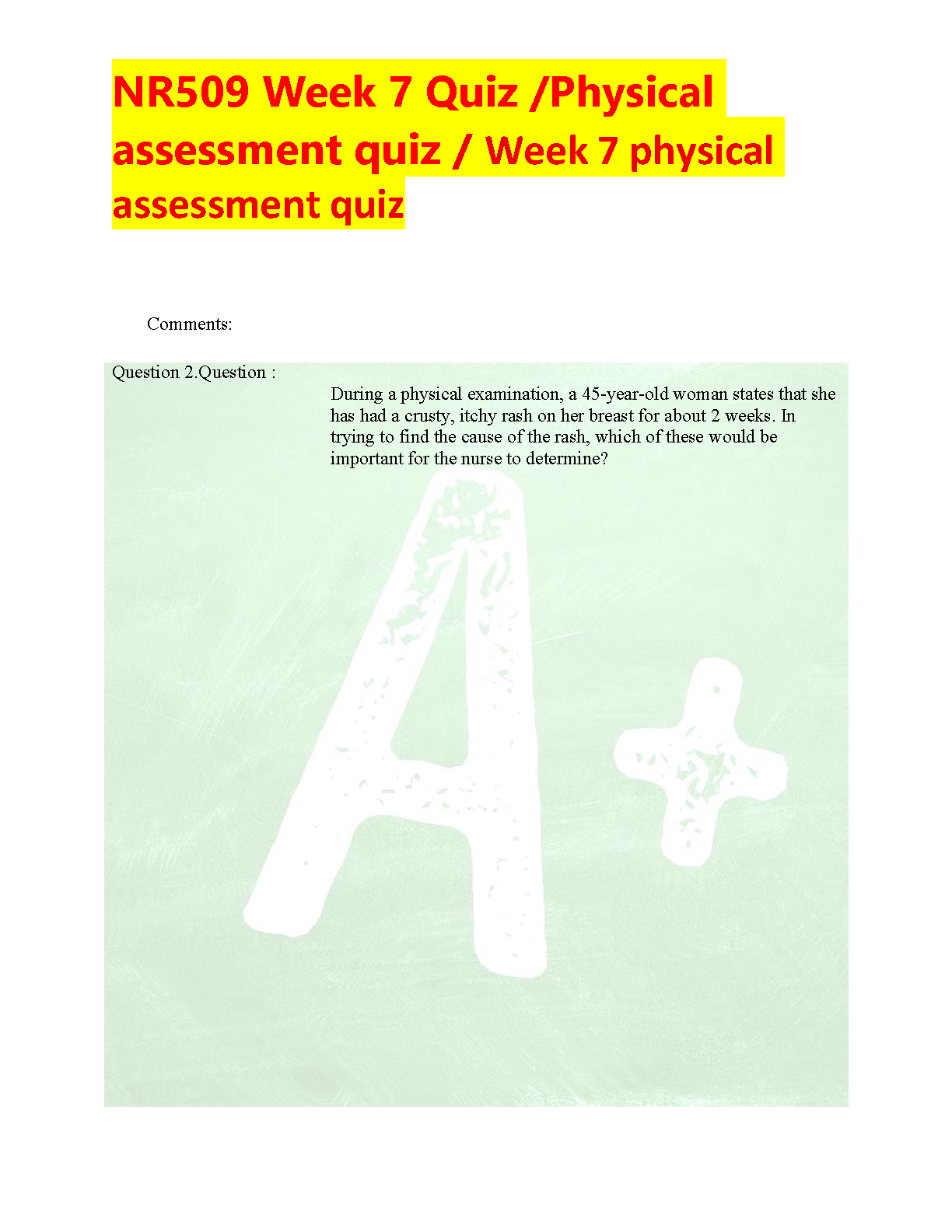 Unlock a perfect score on your NR 509 Week 7 Physical Assessment Quiz with this comprehensive test bank. This resource features all 25 multiple-choice questions, complete with verified correct answers and detailed instructor explanations for each. Aligned with the 'Advanced Health Assessment and Diagnostic Reasoning, 4th Edition' by Dains, Baumann, & Scheibel, this guide is your key to mastering complex concepts. Prepare effectively for the 2025/2026 academic year, understand the rationale behind each answer, and pass your exams on the first attempt, avoiding costly resits.