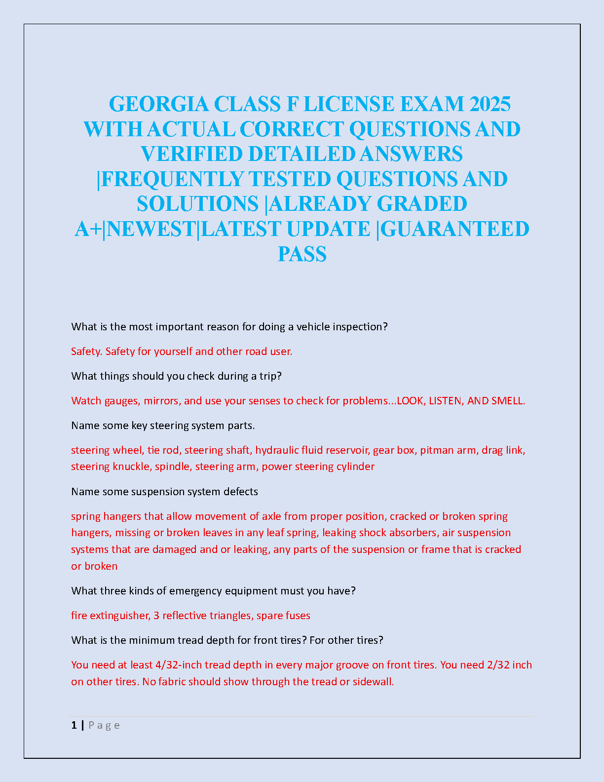 Ready to pass your Georgia Class F License Exam on the very first attempt? This comprehensive test bank for the 2025-2026 exam season is your ultimate key to success. Our guide is packed with actual, frequently tested questions from the official exam, each with a detailed, verified answer to ensure you learn the correct information. Master all critical topics, including pre-trip vehicle inspections, steering and suspension systems, emergency equipment regulations, and safety standards. This A+ graded, up-to-date resource eliminates guesswork, builds your confidence, and guarantees you have the knowledge to ace the test. Avoid the stress of resits and secure your Class F license with this essential study tool.