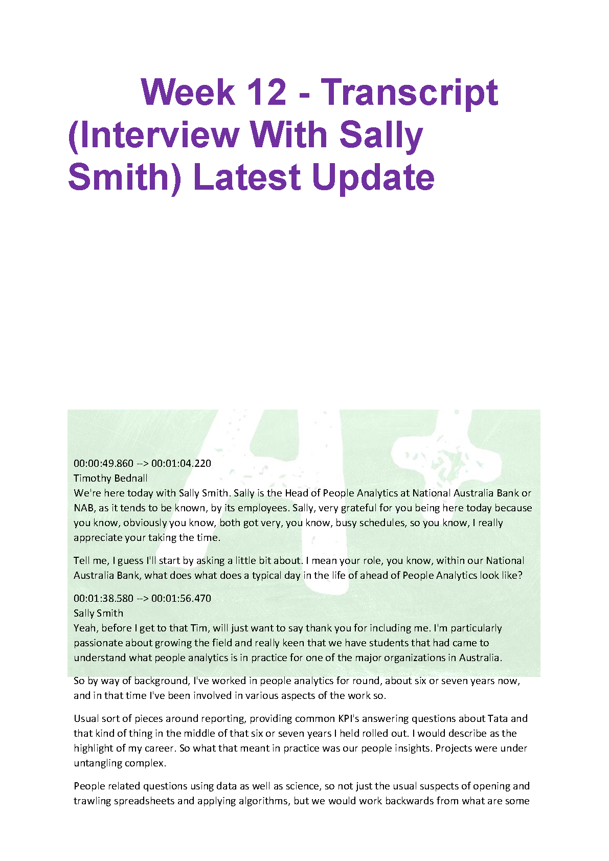 Mastering People Analytics: Expert Insights from Sally Smith (NAB) & Timothy Bednall - Week 12 Transcript for 2025/2026 Exam Success