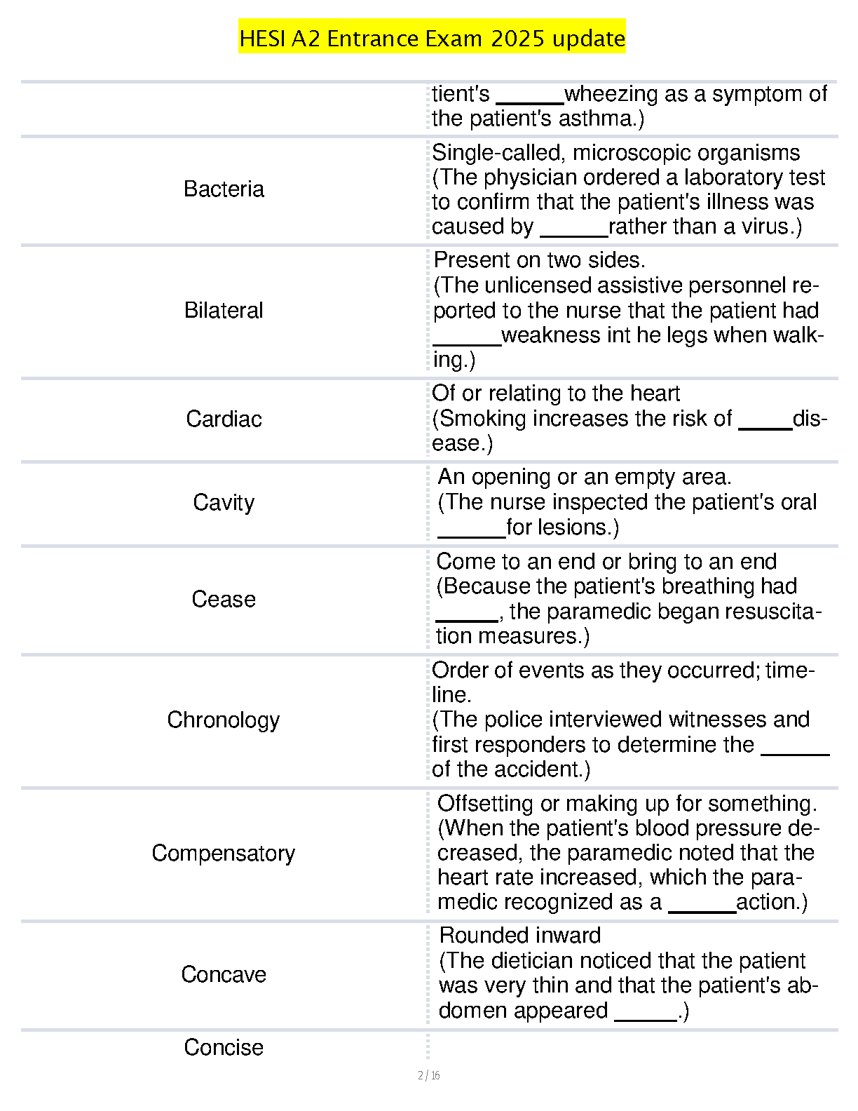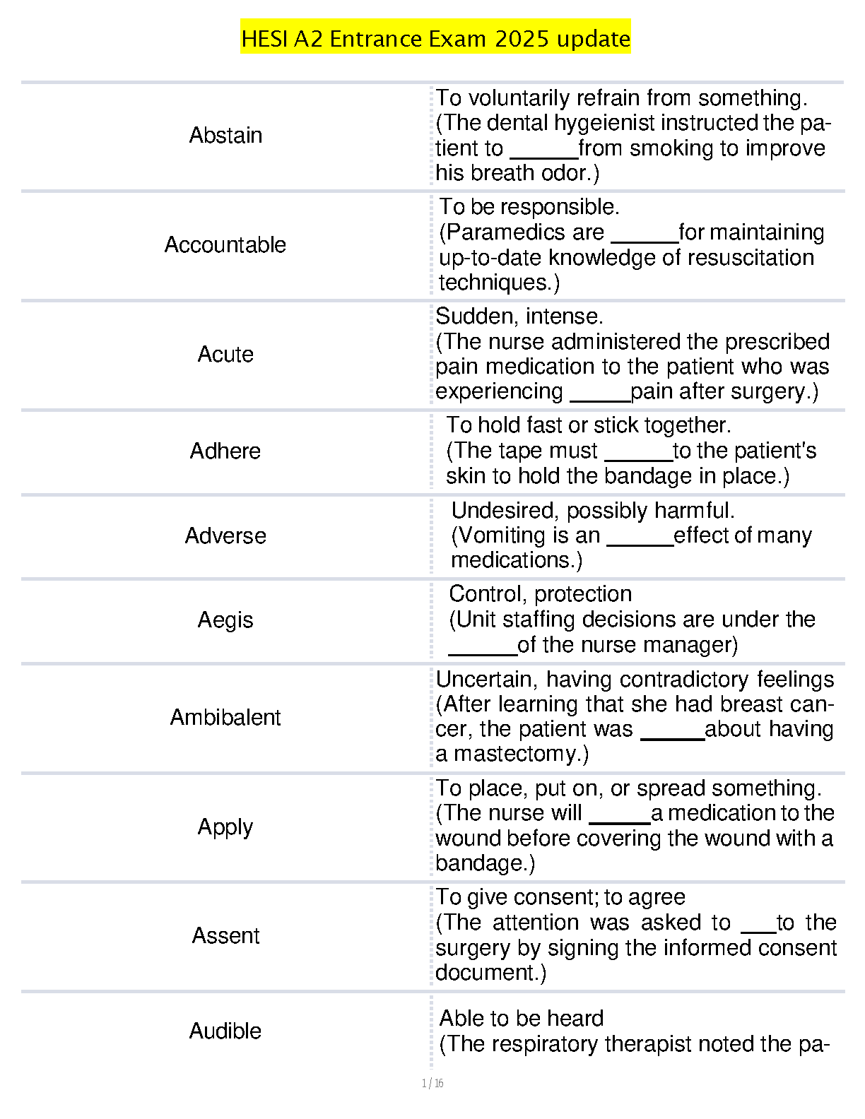 Get ready to ace the HESI A2 Entrance Exam on your first try with our comprehensive vocabulary study guide, fully updated for the 2025-2026 testing cycle. This essential resource is specifically designed to help aspiring nursing students master the critical vocabulary needed for success. Inside, you'll find a detailed list of key terms, each with a clear definition and a practical example sentence to show how it's used in a healthcare context. Stop worrying about resits and build the confidence you need to excel. This study guide is your ultimate tool for mastering the HESI A2 vocabulary section and securing your spot in nursing school.