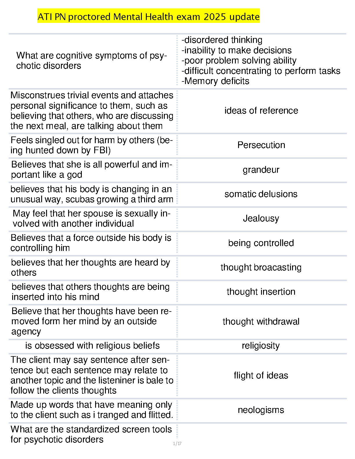 Ace your ATI PN Mental Health Proctored Exam with this ultimate study resource for the 2025/2026 academic year! This comprehensive guide features an updated collection of detailed questions and verified answers, meticulously designed to cover all essential topics you'll face on the exam. Master complex concepts like cognitive symptoms of psychotic disorders, different types of delusions (persecution, grandeur, somatic), and thought disturbances. The straightforward Q&A format simplifies difficult topics, making it the perfect tool for effective revision. Boost your confidence and pass on your very first attempt, avoiding the stress of resits.