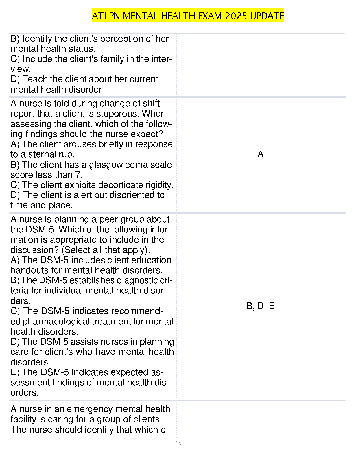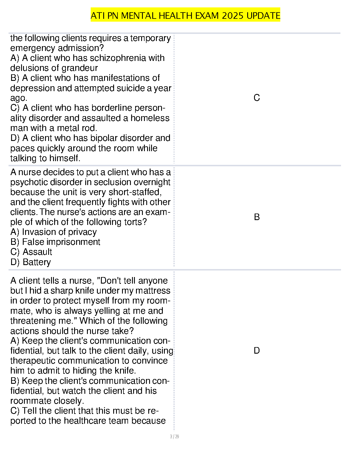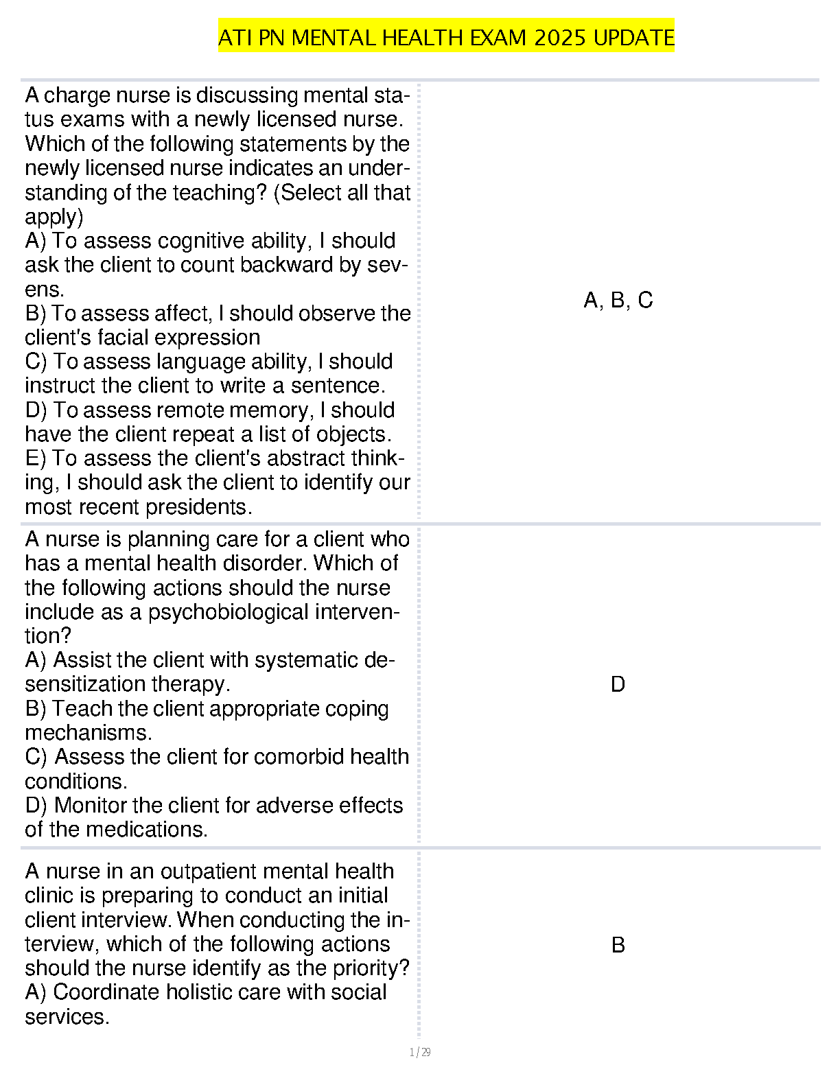 ATI PN Mental Health Exam 2025 Test Bank: Comprehensive Q&A Study Guide by Assessment Technologies Institute for First-Time Success