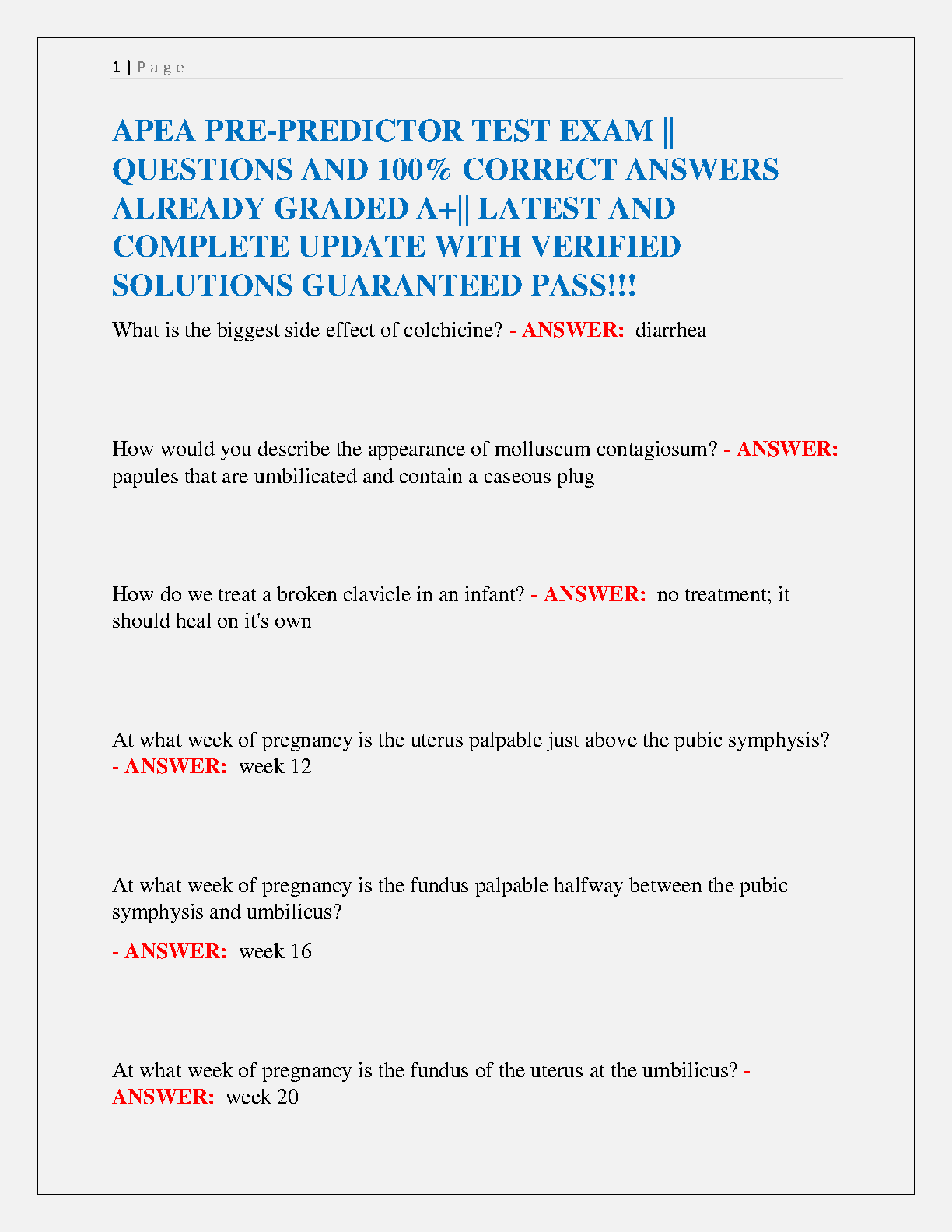 Master the APEA Pre-Predictor Exam with our latest 2024-2025 study guide. This comprehensive resource provides a complete set of questions paired with 100% correct, verified answers, designed to help you achieve an A+ grade. Our expertly compiled material covers all essential topics, ensuring you are fully prepared to pass your certification exam on the very first attempt. Stop worrying about resits and start studying with confidence. This guide is your key to success in becoming a certified nurse practitioner.