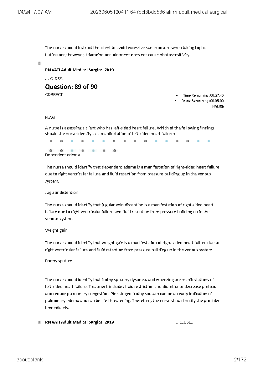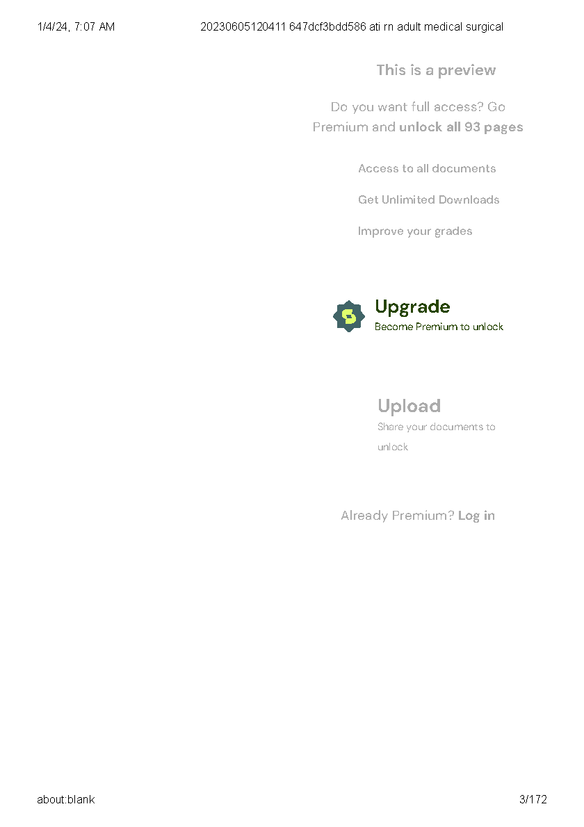 Excel in your nursing studies with our comprehensive study guide for the ATI RN Adult Medical Surgical Proctored Exam 2023. This resource is a complete test bank featuring all 90 questions and their correct, verified answers, which achieved a Grade A. Spanning 172 pages, this guide is meticulously designed to help you master the material, understand the exam structure, and boost your confidence. Updated for the 2025-2026 academic year, it's the ultimate tool to ensure you pass your Med-Surg exam on the very first attempt and avoid costly resits. Get instant access to the proven materials you need for success!