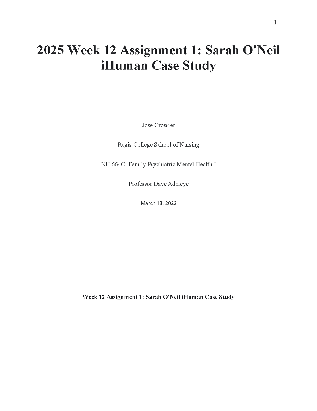 Unlock academic success in your NU 664C Family Psychiatric Mental Health I course with this comprehensive iHuman case study on Sarah O'Neil. This expertly completed assignment, fully updated for the 2025/2026 academic year, provides a detailed walkthrough and analysis. It's the perfect study aid to help you understand complex concepts, master the iHuman platform, and confidently pass your exams on the first try. Download now to secure your A+ grade and avoid costly resits!