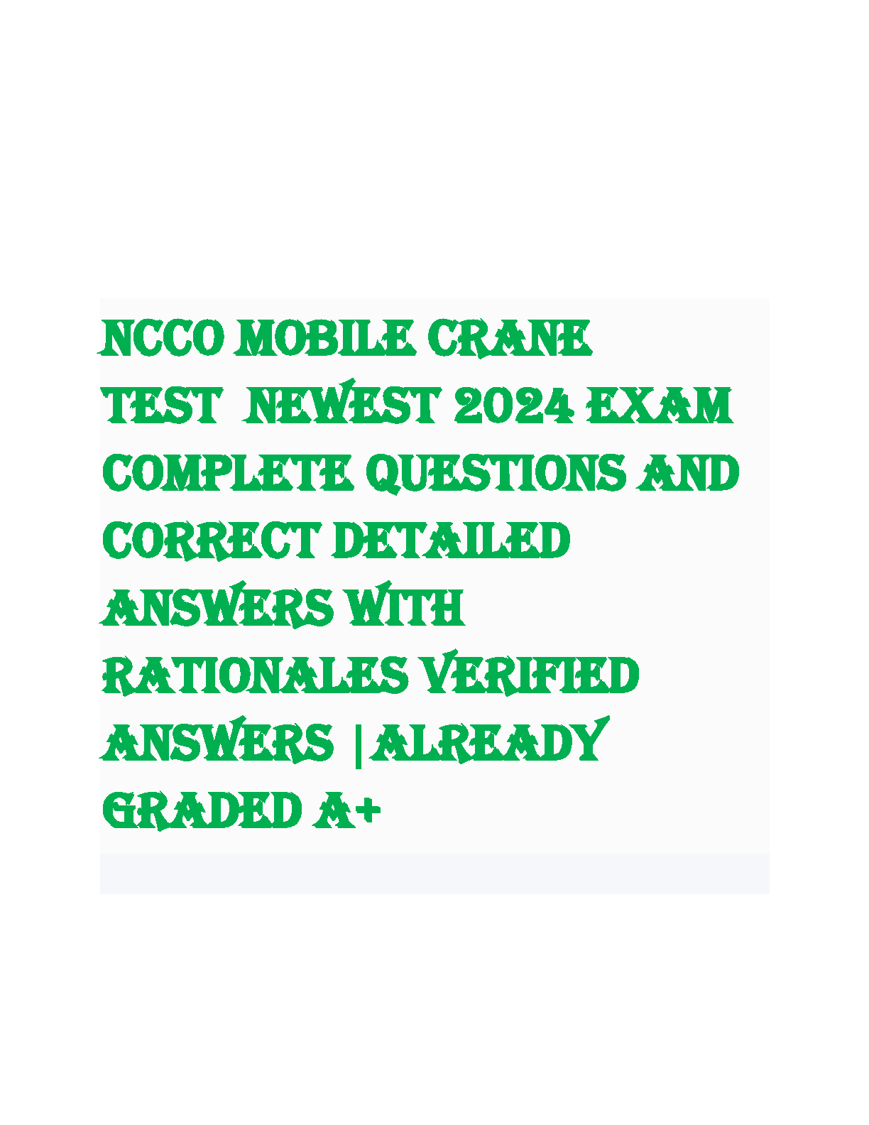Unlock success in your NCCCO Mobile Crane Operator certification with our premier 2024 exam study guide. This all-inclusive test bank provides a thorough compilation of the latest exam questions, complete with 100% accurate and verified answers. Each solution is explained with a detailed rationale, helping you not just memorize, but truly understand the core principles of mobile crane operation and safety. This resource is your key to acing the exam, building confidence, and achieving that A+ grade on your first attempt. Don't leave your certification to chance—prepare with the best!