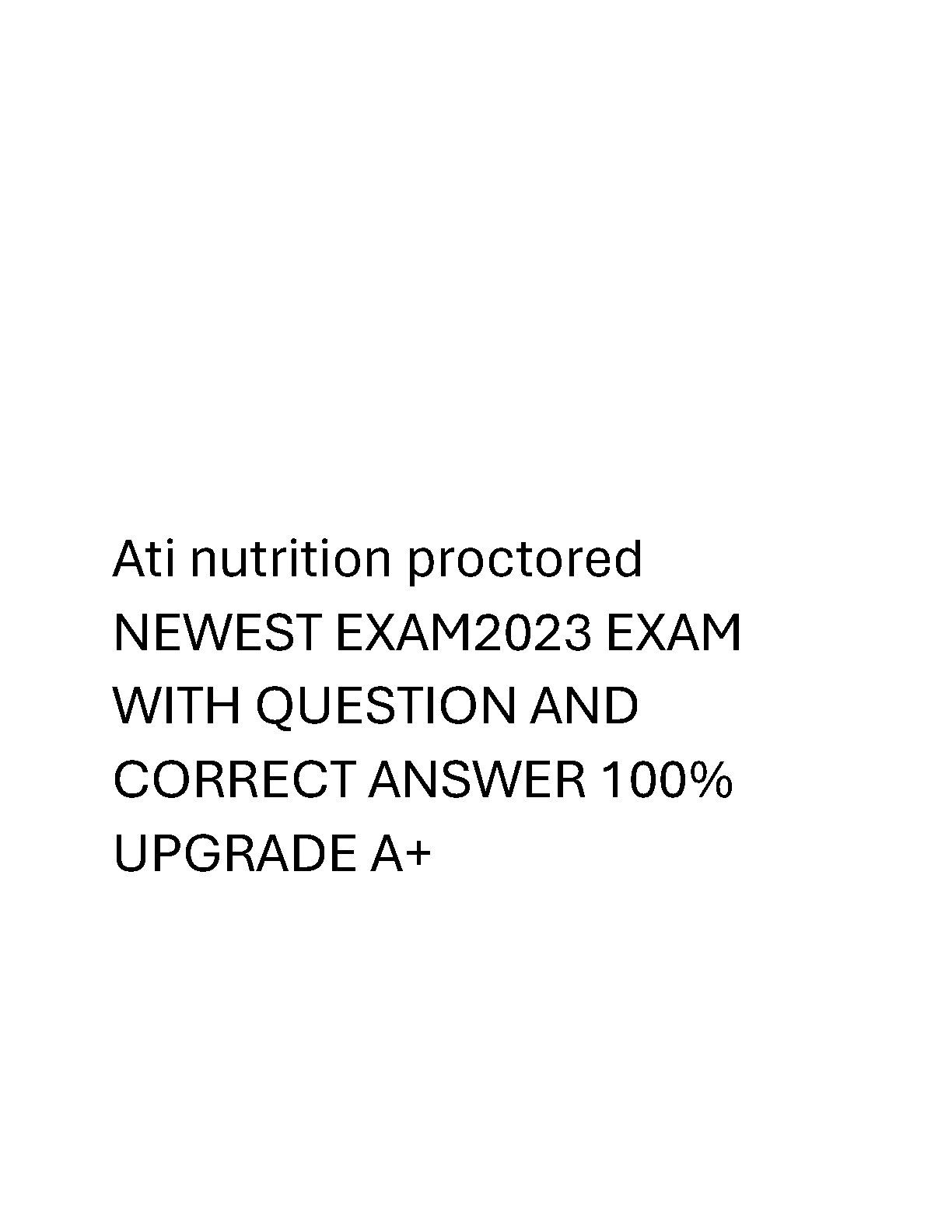 Unlock your A+ potential with our latest 2024 test bank for the ATI Nutrition Proctored Exam. This essential study resource provides a complete set of real exam questions paired with 100% accurate and verified answers. Designed to help you master key nutrition concepts and ace your exam on the first attempt, this guide is your ultimate tool for success. Say goodbye to exam stress and hello to top grades!