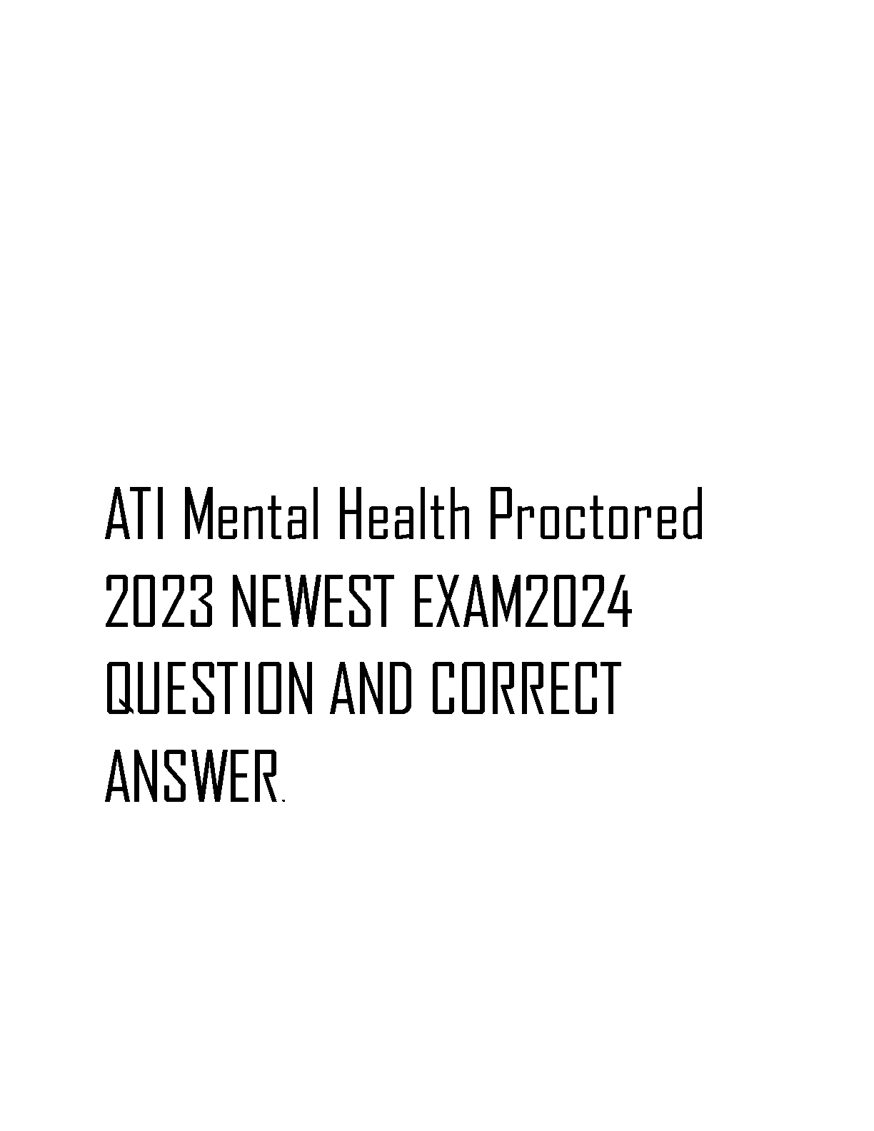 Master the ATI Mental Health Proctored Exam with our latest 2024 test bank. This comprehensive study guide features an extensive collection of the newest exam questions, each paired with a verified, correct answer. Designed to help you understand key psychiatric nursing concepts and exam formats, this resource is your ultimate tool for success. Boost your confidence, study efficiently, and ensure you pass on your first try.