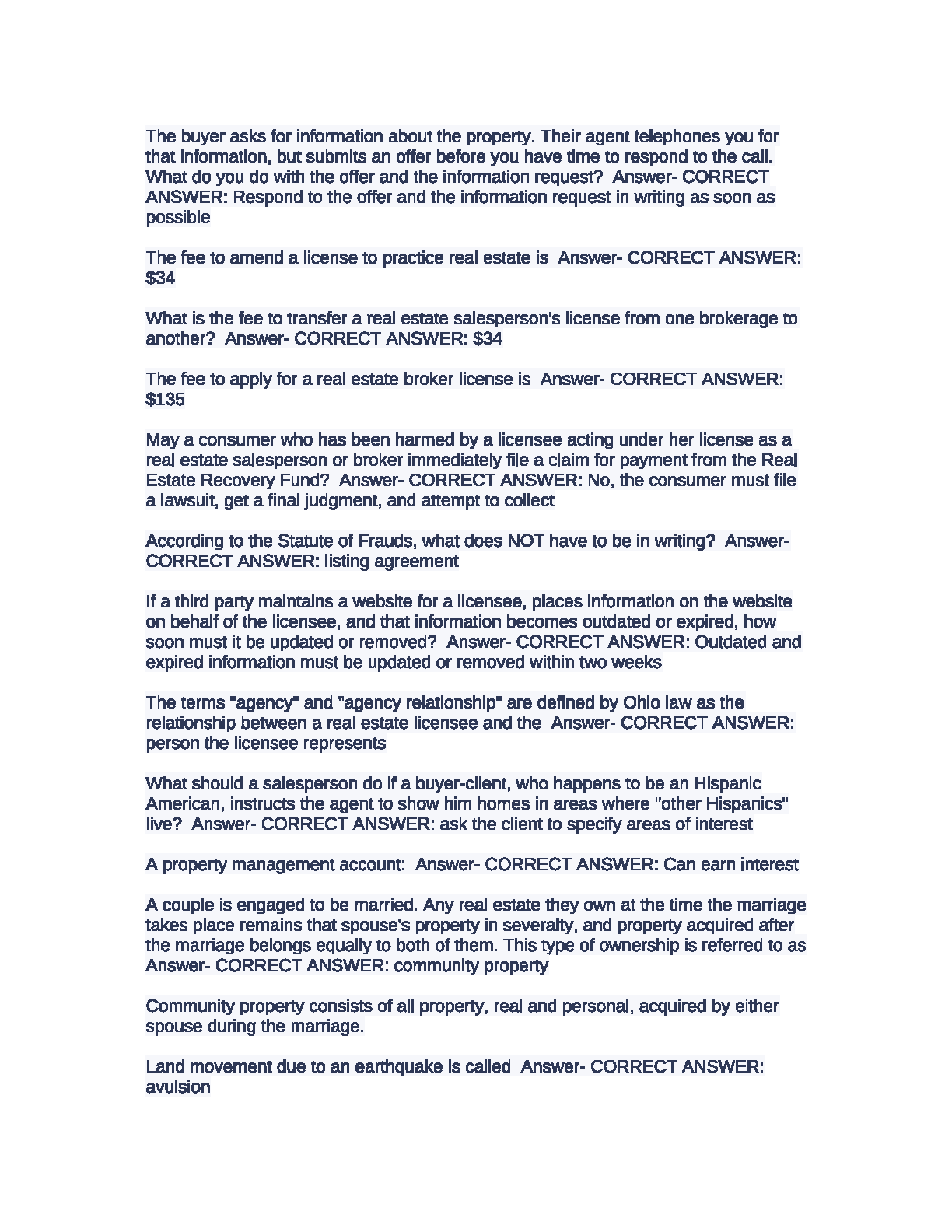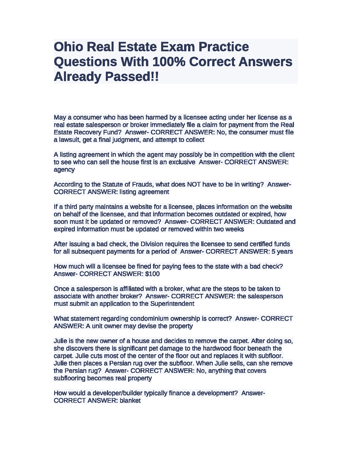 Unlock your career in real estate with our definitive Ohio Real Estate Exam Test Bank for the 2025/2026 academic year. This comprehensive resource is expertly designed to help you pass your licensing exam on the very first try, eliminating the stress and cost of resits. It features a curated collection of practice questions that mirror the actual exam, complete with 100% verified and correct answers. Master key topics including real estate law, contracts, agency relationships, property ownership, and financing. Get the confidence you need to succeed and start your journey as an Ohio real estate professional today!