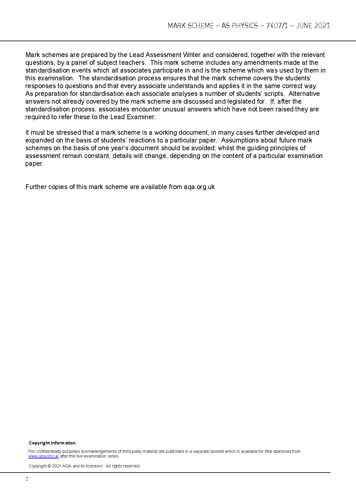 AQA AS Physics Paper 1 (7407/1) Mark Scheme June 2021 | Updated for 2025/2026 First-Attempt Exam Success