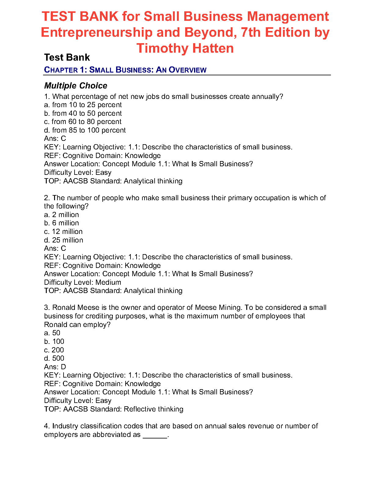 Master your small business management course with the official Test Bank for the 7th Edition of 'Small Business Management: Creating a Sustainable Competitive Advantage' by Timothy S. Hatten. This comprehensive guide provides an extensive collection of exam-style questions with detailed answers, covering all essential topics from the textbook. It's the ultimate study tool to help you grasp complex concepts, test your knowledge, and confidently pass your exams with excellent grades. Get immediate access and start preparing for success today!