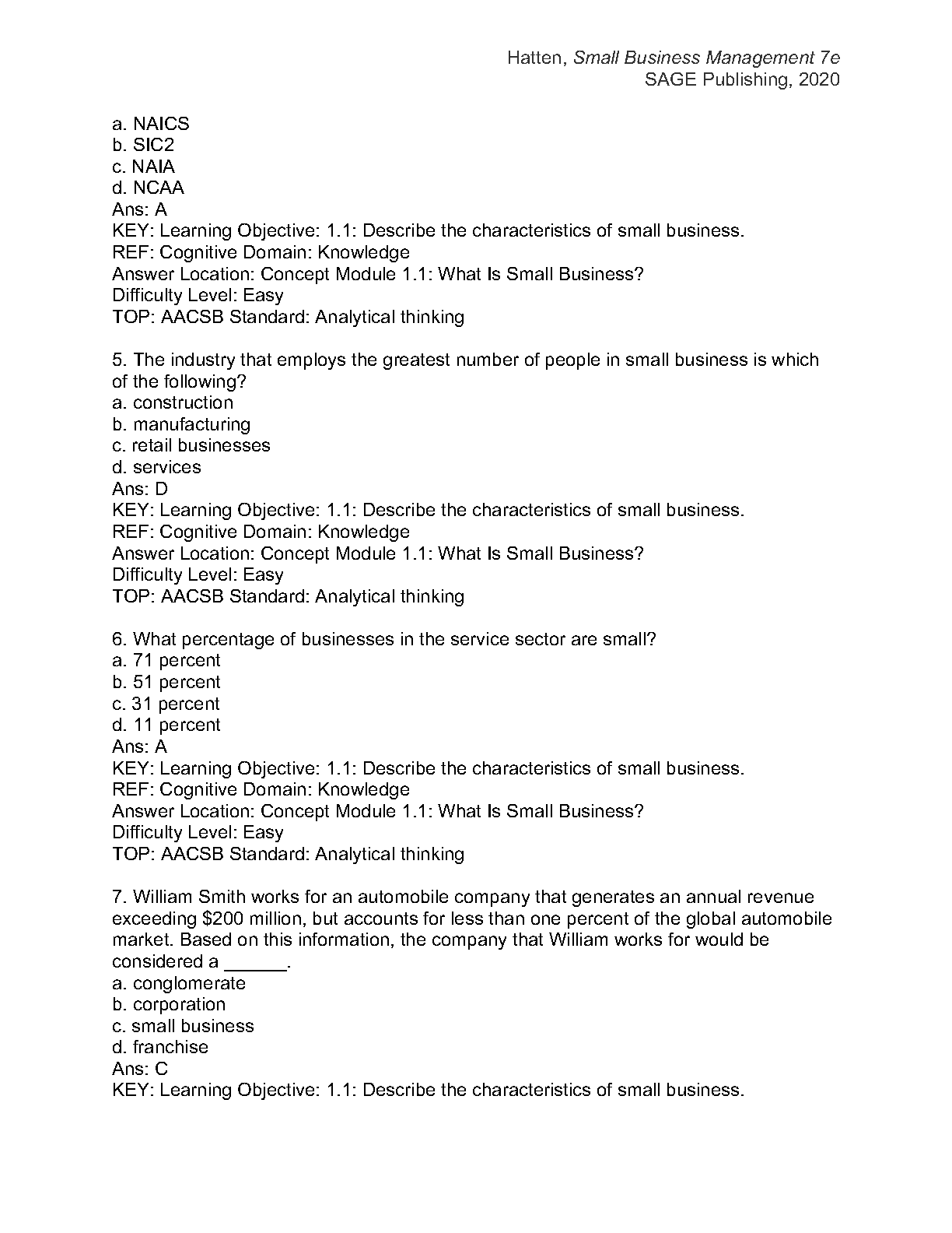 Test Bank for Small Business Management: Creating a Sustainable Competitive Advantage, 7th Edition by Timothy S. Hatten