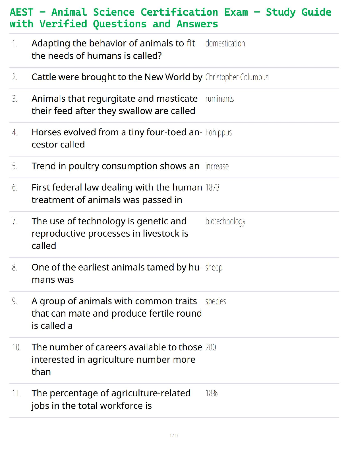 Prepare to excel in your AEST Animal Science Certification Exam with our comprehensive study resource. This up-to-date test bank for the 2025/2026 academic year features a complete collection of verified questions and detailed, accurate answers covering all essential topics. Our guide is meticulously designed to help you master key concepts in animal science, from domestication and biotechnology to industry trends, ensuring you have the knowledge to pass on your first attempt. Download now for instant access and ace your certification!