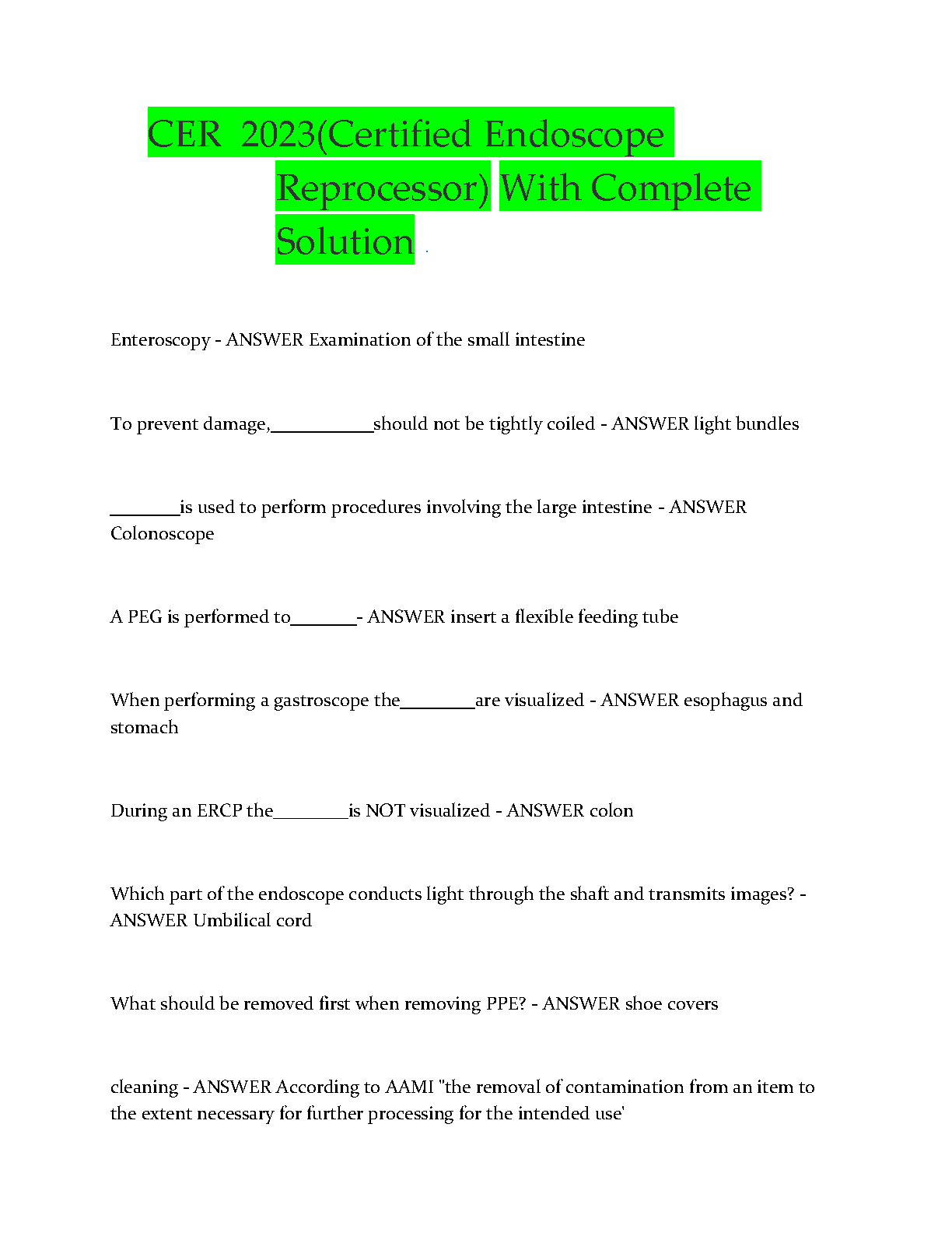 Get ready to ace your Certified Endoscope Reprocessor (CER) exam with our newly updated 2025/2026 test bank! This comprehensive resource is expertly designed to help you pass on your very first attempt, eliminating the stress of resits. Our test bank features a complete collection of exam-style questions, each paired with a verified and detailed solution. You'll master crucial topics including different endoscopic procedures like enteroscopy and colonoscopy, proper handling and reprocessing techniques, safety protocols such as PPE removal, and essential AAMI standards for cleaning. Stop memorizing and start understanding with this ultimate study guide. Download now and take the first step towards your CER certification with confidence!