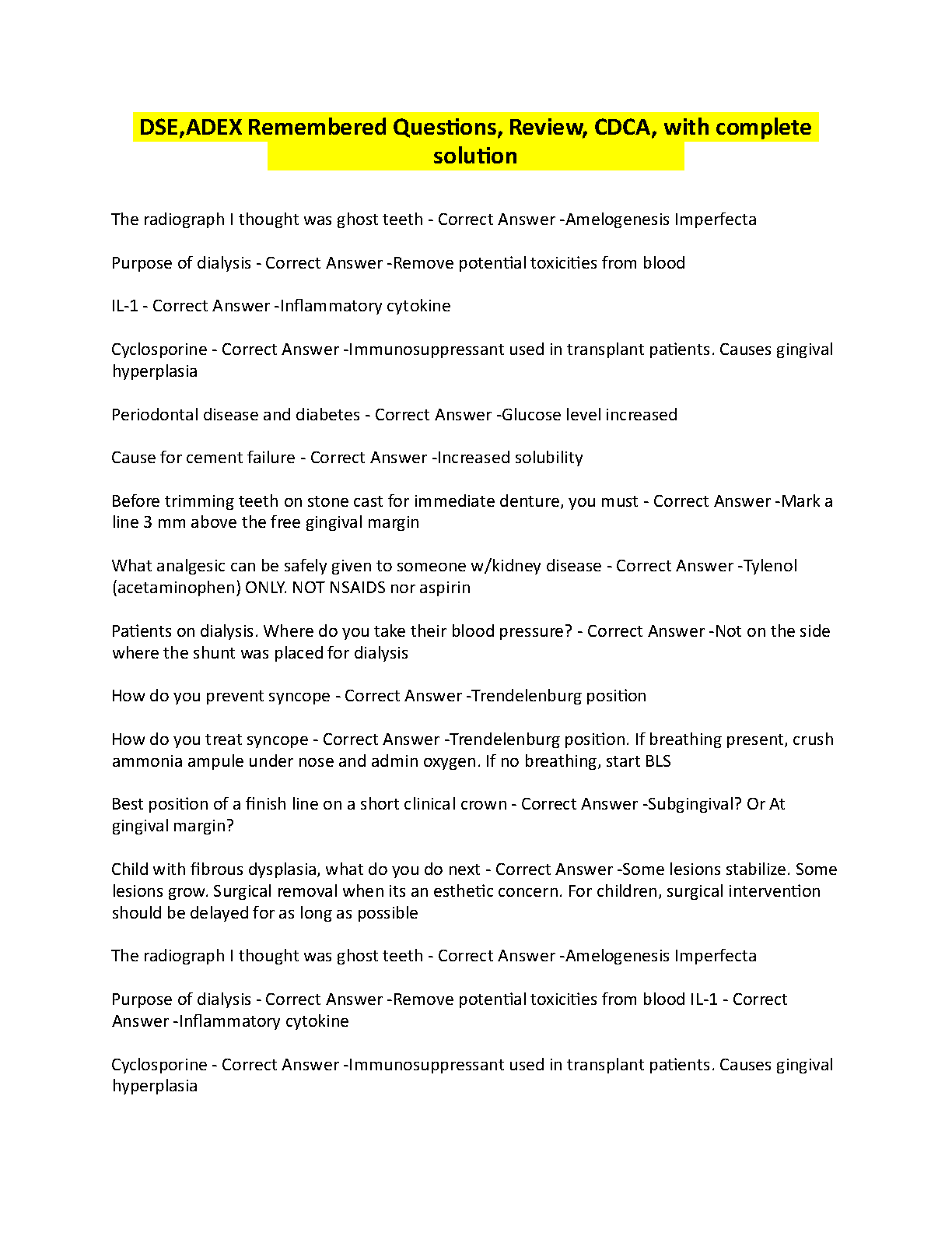 ADEX, CDCA, DSE Dental Board Exam Test Bank: Comprehensive Q&A with Complete Solutions