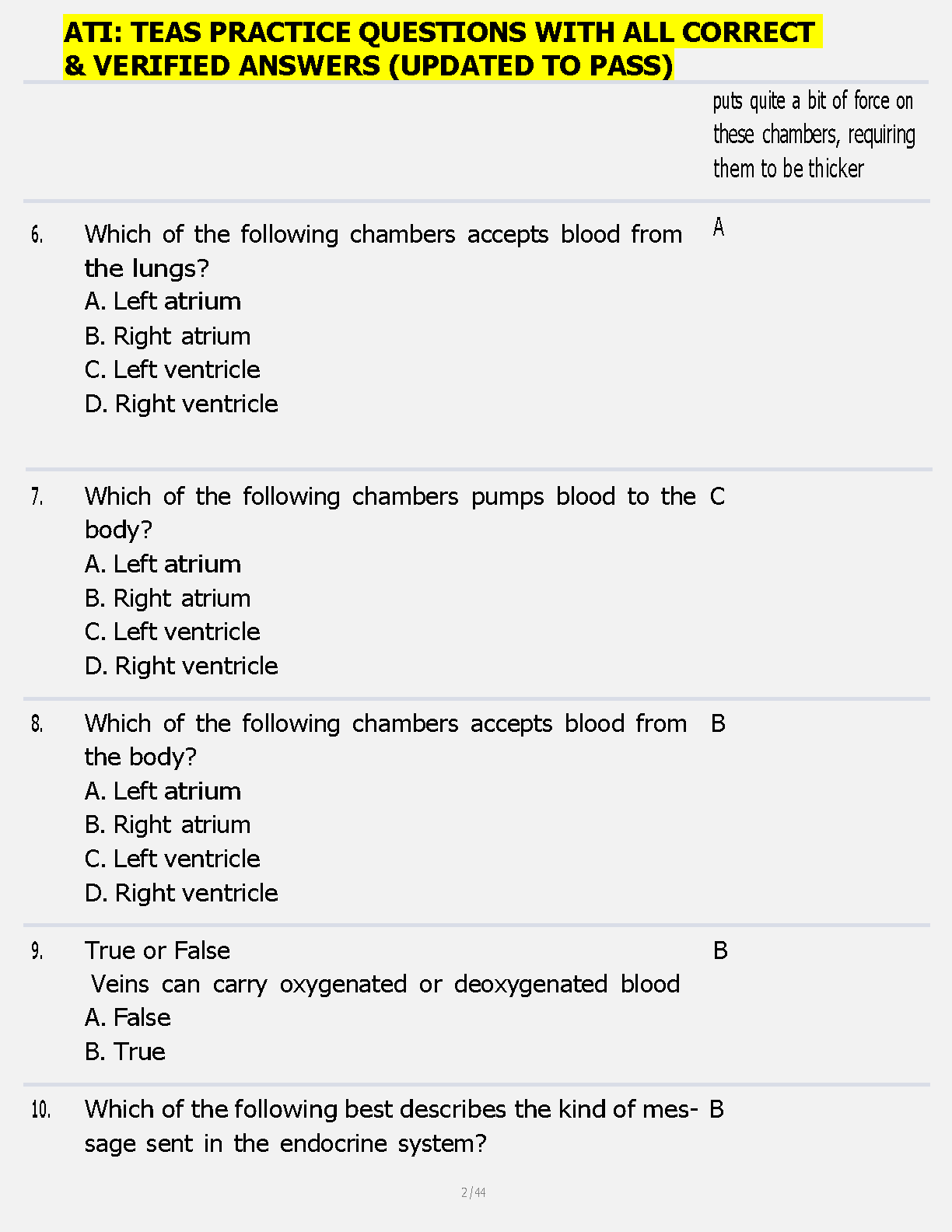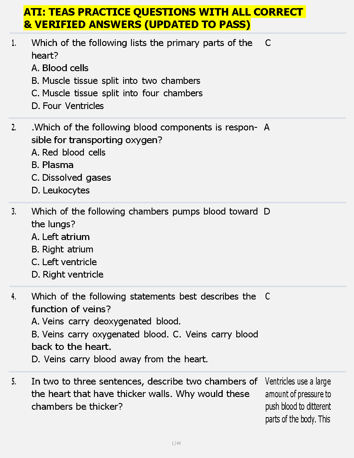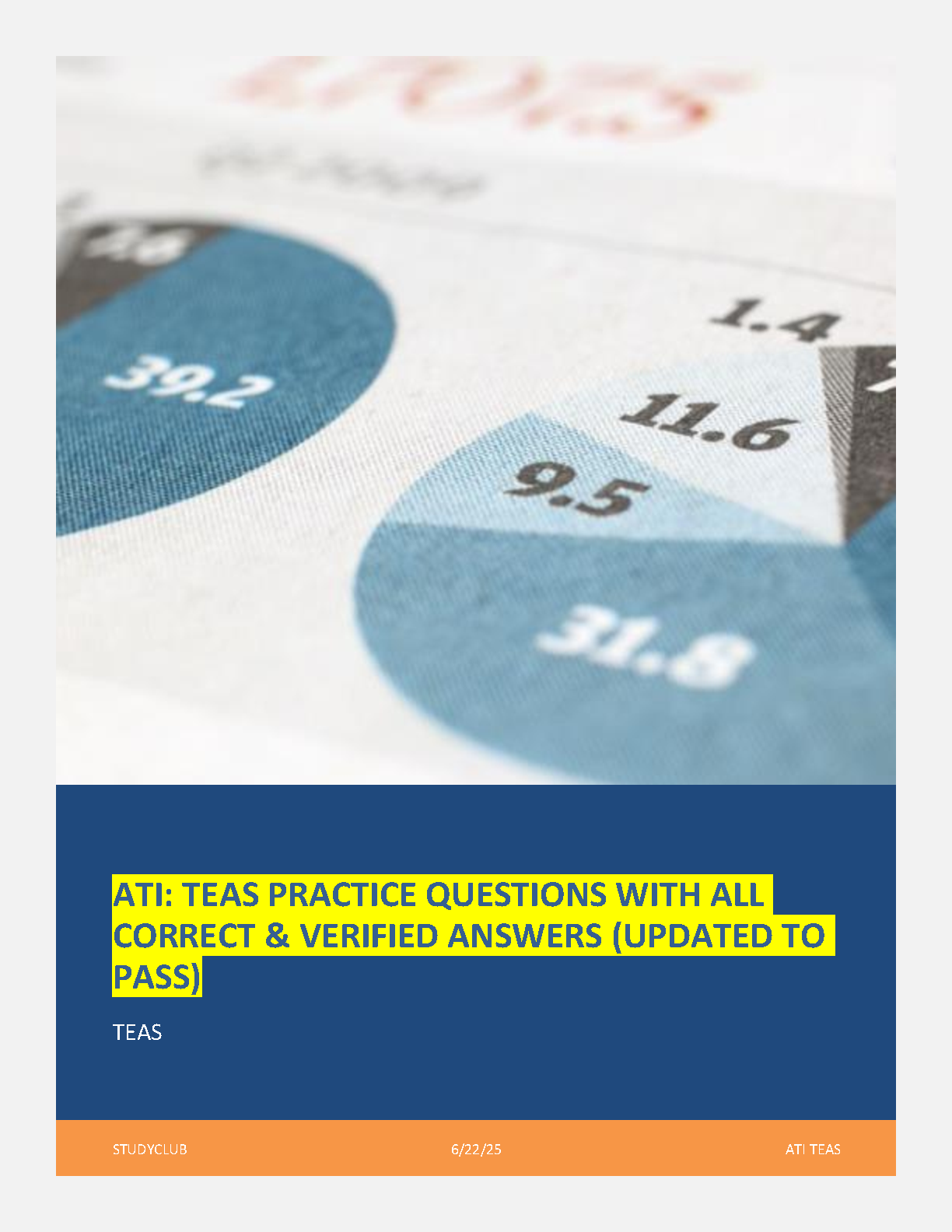 Prepare to excel on your nursing school entrance exam with our latest ATI TEAS Test Bank for the 2025/2026 academic year. This ultimate study guide is packed with hundreds of practice questions covering all sections of the TEAS 7 exam. Each question comes with a correct, verified answer, providing you with the essential practice needed to master the material. This resource is expertly designed to help you identify your strengths and weaknesses, build confidence, and pass the ATI TEAS on your very first try. Stop worrying about resits and secure your spot in nursing school!