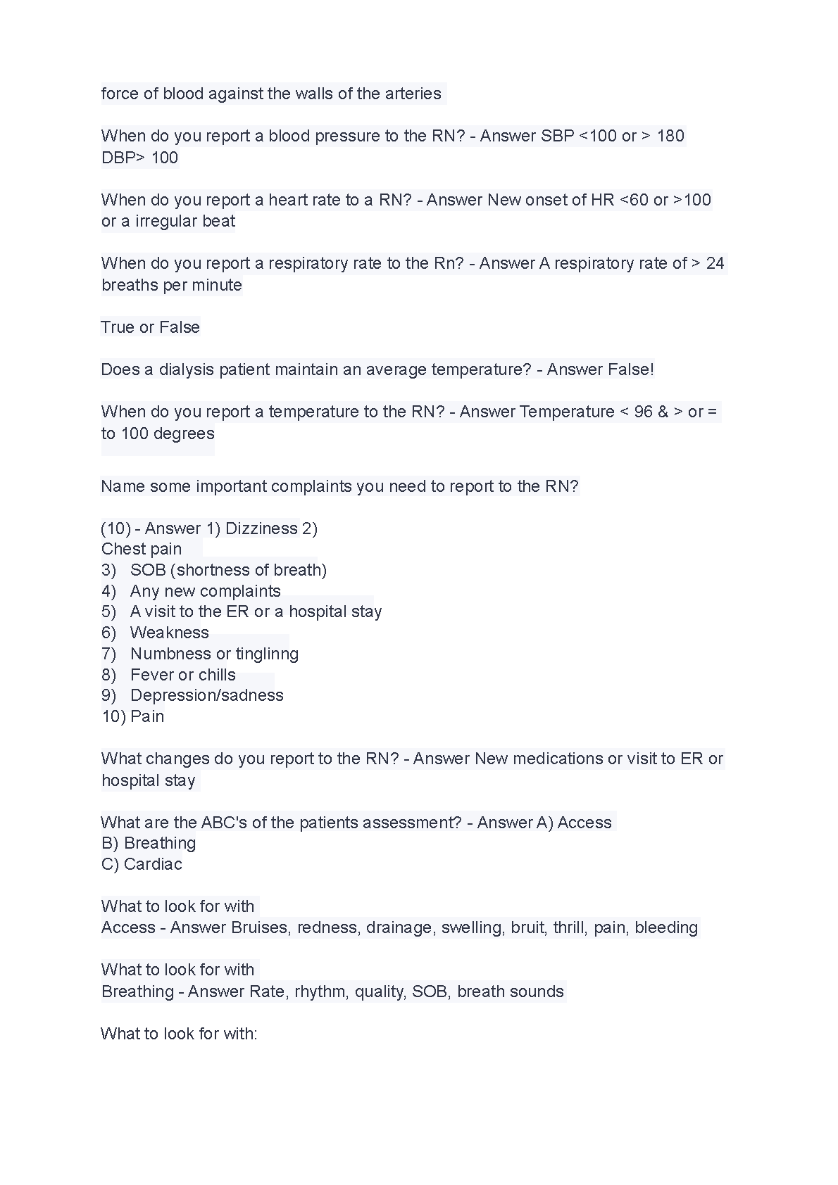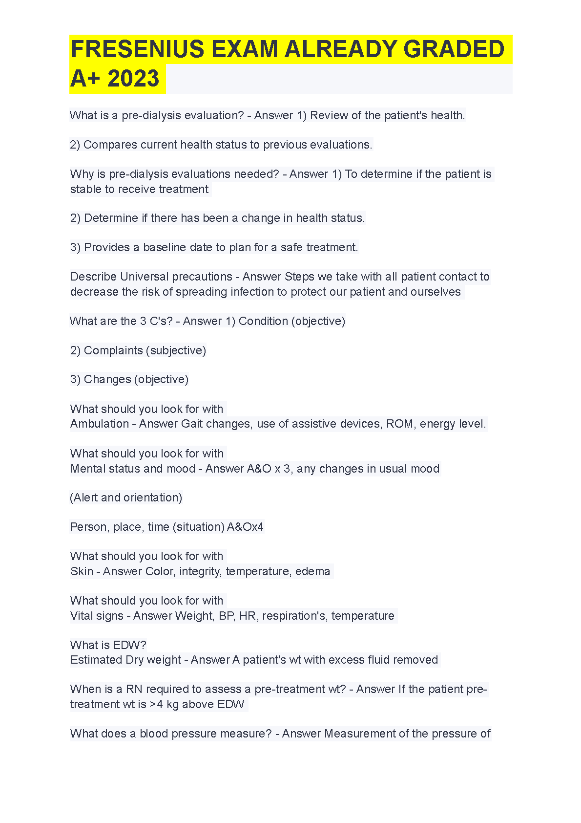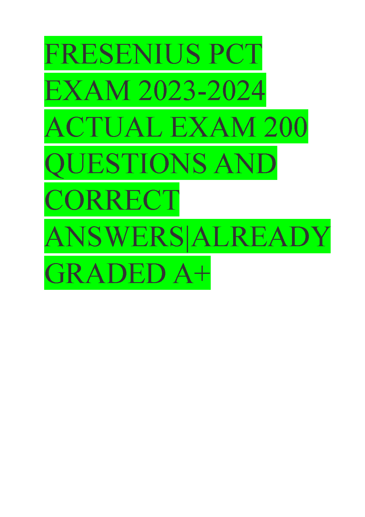 Prepare to ace your Fresenius Patient Care Technician (PCT) certification with our comprehensive test bank for the 2023-2024 exam. This essential study tool features 200 actual exam questions, each paired with a correct, verified answer. Designed to mirror the real testing experience, this resource is your key to mastering the material and passing on your first attempt. Achieve an A+ grade and start your career with confidence. Avoid resits and ensure success with this top-rated Fresenius PCT exam prep.