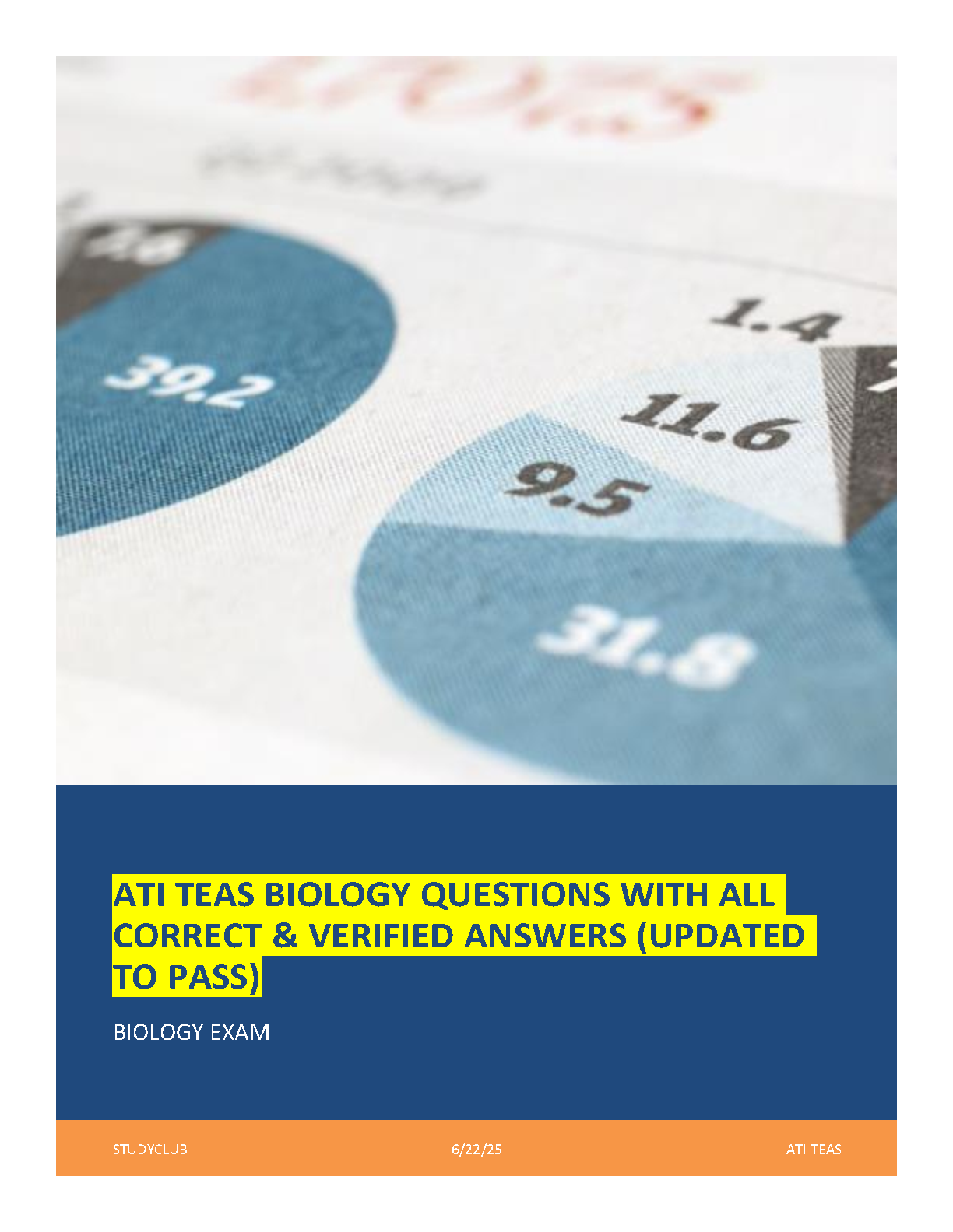 Ace the Biology section of the ATI TEAS 7 exam with our newly updated 2025-2026 test bank. This essential study guide provides a comprehensive collection of practice questions, complete with 100% correct and verified answers. Designed to mirror the actual exam format, this resource will help you master key biological concepts, boost your confidence, and ensure you pass on your very first attempt. Avoid the stress of resits and secure your spot in nursing school with this ultimate preparation tool.
