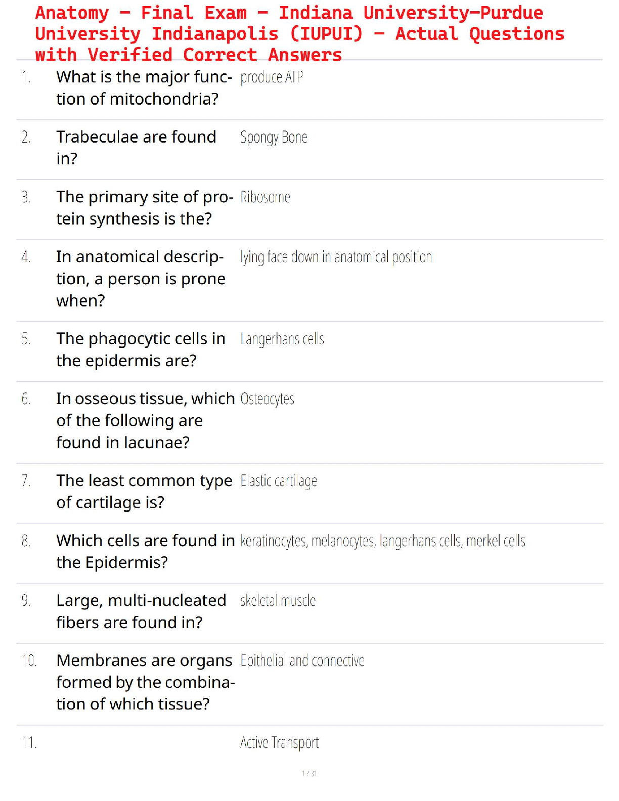 Struggling with your Anatomy final at Indiana University-Purdue University Indianapolis (IUPUI)? This is the ultimate study resource you need. Our comprehensive test bank for the IUPUI Anatomy Final Exam is a freshly updated collection for the 2025/2026 academic year. It features a complete set of actual exam questions, each paired with a verified, correct answer. This Q&A guide is meticulously designed to cover all key topics, helping you master the material, build confidence, and pass your exam on the very first attempt. Avoid the stress of resits by studying smarter with this proven resource. Download now and ace your anatomy final!