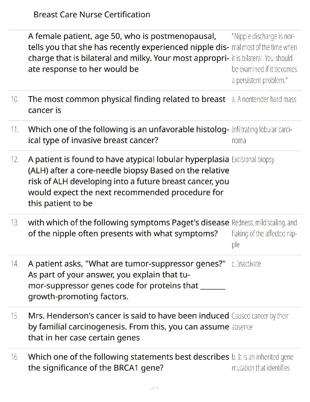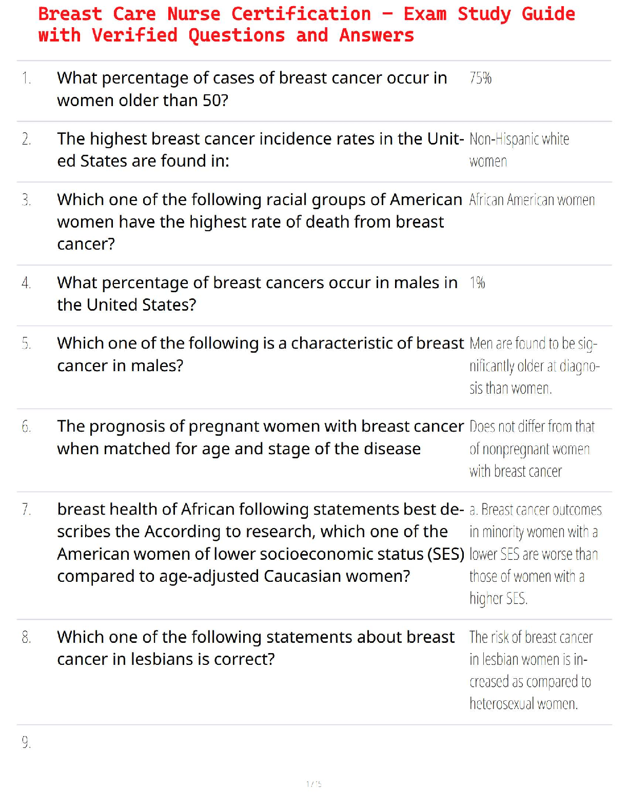 Master the Breast Care Nurse Certification (BCNC®) exam with our cutting-edge 2025/2026 Test Bank. This all-inclusive study resource is packed with verified questions and in-depth answers, mirroring the format and content of the official certification test. It provides essential practice on crucial topics, including breast cancer statistics, risk factors in diverse populations, and clinical prognosis scenarios. Designed to help you study efficiently and effectively, this guide is your key to passing the exam on your first attempt, avoiding costly and stressful resits. Download now to secure your certification success.