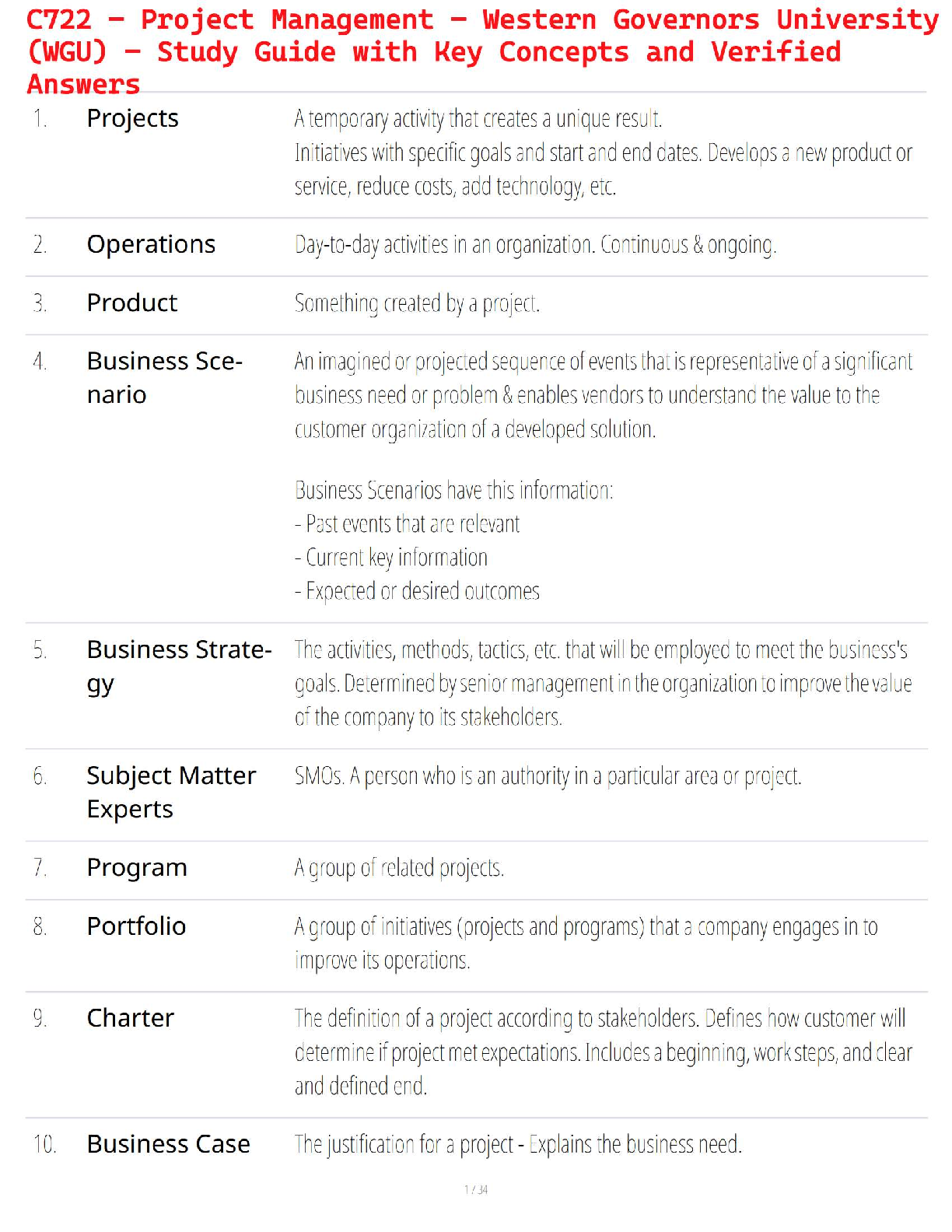 Master the fundamentals of Project Management with our all-inclusive study guide, specifically tailored for WGU's C722 course. Updated for the 2025/2026 academic year, this guide simplifies complex topics into easy-to-understand key concepts with verified, accurate answers. It's the perfect resource to boost your confidence, streamline your studying, and ensure you pass your final exam on the first attempt, saving you from the stress of resits.