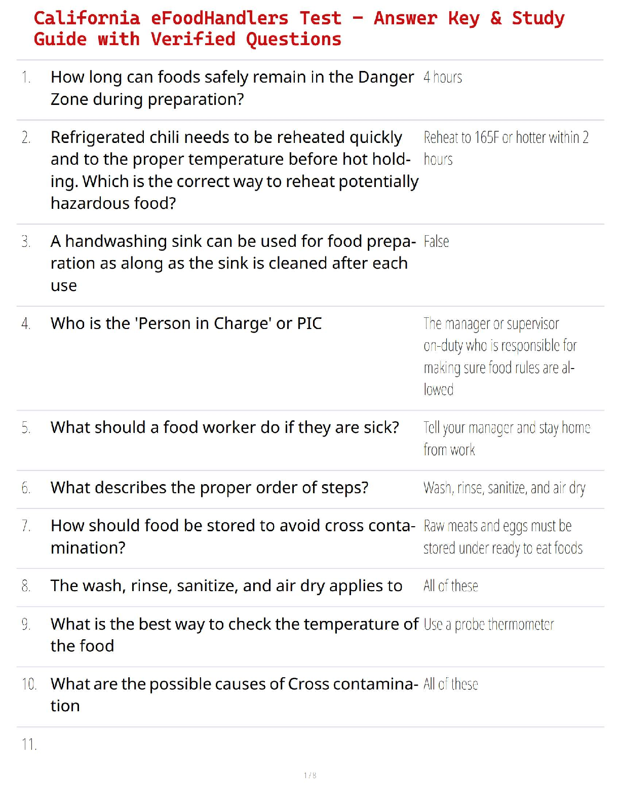Get ready to ace your California eFoodHandlers certification with our comprehensive 2025/2026 study guide. This essential resource is packed with verified test questions and detailed answers, covering all critical food safety topics you need to know. From understanding the 'Danger Zone' and proper reheating procedures to mastering cross-contamination prevention and sanitization steps, this guide ensures you're fully prepared. Stop worrying about resits—use this answer key to master the material and earn your food handler card on the very first try!