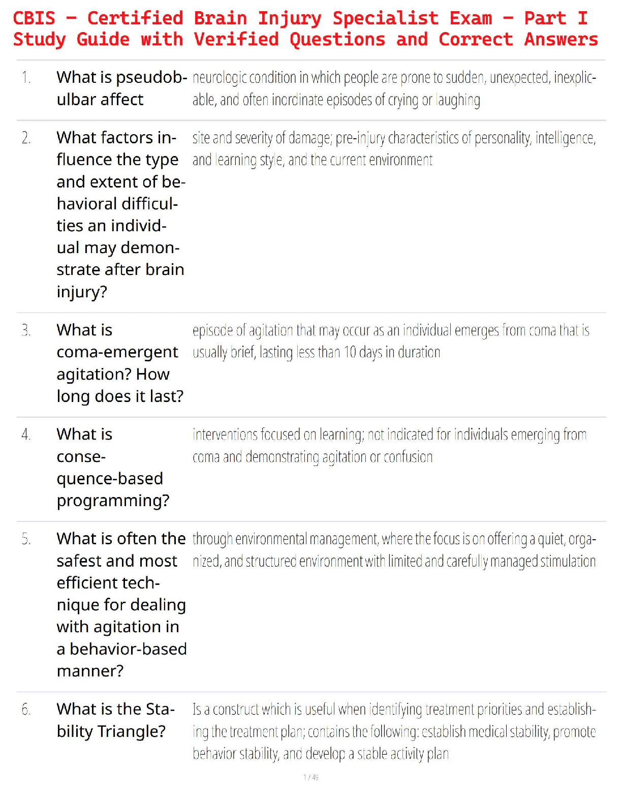 Ace your Certified Brain Injury Specialist (CBIS) exam with confidence! This comprehensive test bank is your ultimate study companion, meticulously designed to help you pass on your very first attempt. Featuring an extensive collection of exam-style questions paired with 100% verified and correct answers, this guide covers all critical topics you'll encounter on the actual test. Move beyond simple memorization and gain a deep understanding of core concepts like pseudobulbar affect, behavioral management, and treatment planning. Stop worrying about resits and start your journey to becoming a Certified Brain Injury Specialist. Download now to secure your certification success!