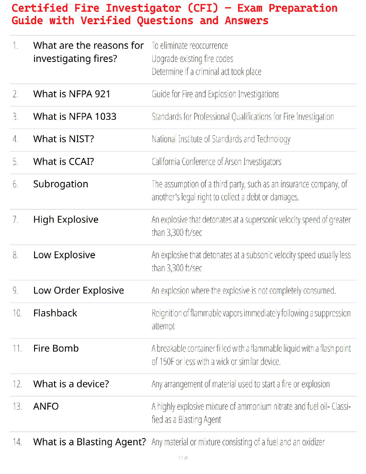 Unlock your potential and pass the IAAI Certified Fire Investigator (CFI) exam with confidence using our latest 2025/2026 Test Bank. This comprehensive resource is packed with hundreds of verified questions and detailed answers, meticulously curated to align with the core principles of NFPA 921 (Guide for Fire and Explosion Investigations) and NFPA 1033 (Standard for Professional Qualifications for Fire Investigator). Our guide covers all essential topics, from fundamental investigation reasons and key terminology to complex concepts like subrogation and explosive classifications. This is the ultimate study tool designed to help you master the material, avoid resits, and achieve your CFI certification on the very first attempt. Get instant access and start preparing for success today!