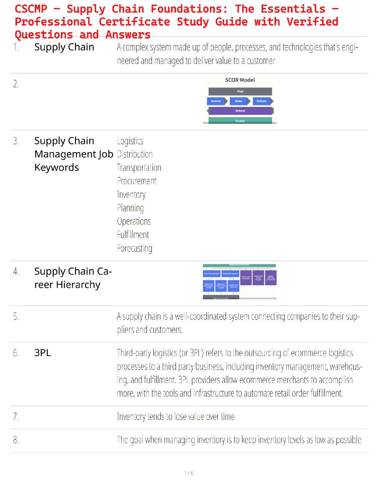 Ace your CSCMP Professional Certificate exam with this comprehensive test bank for 'Supply Chain Foundations: The Essentials'. This essential resource provides a complete set of verified questions and answers, covering all critical topics you'll face on the test. Master key concepts such as the SCOR model, logistics, distribution, transportation, procurement, inventory management, and 3PL. Our expertly curated material is designed to ensure you're fully prepared to pass on your first attempt and earn your professional certification in supply chain management.