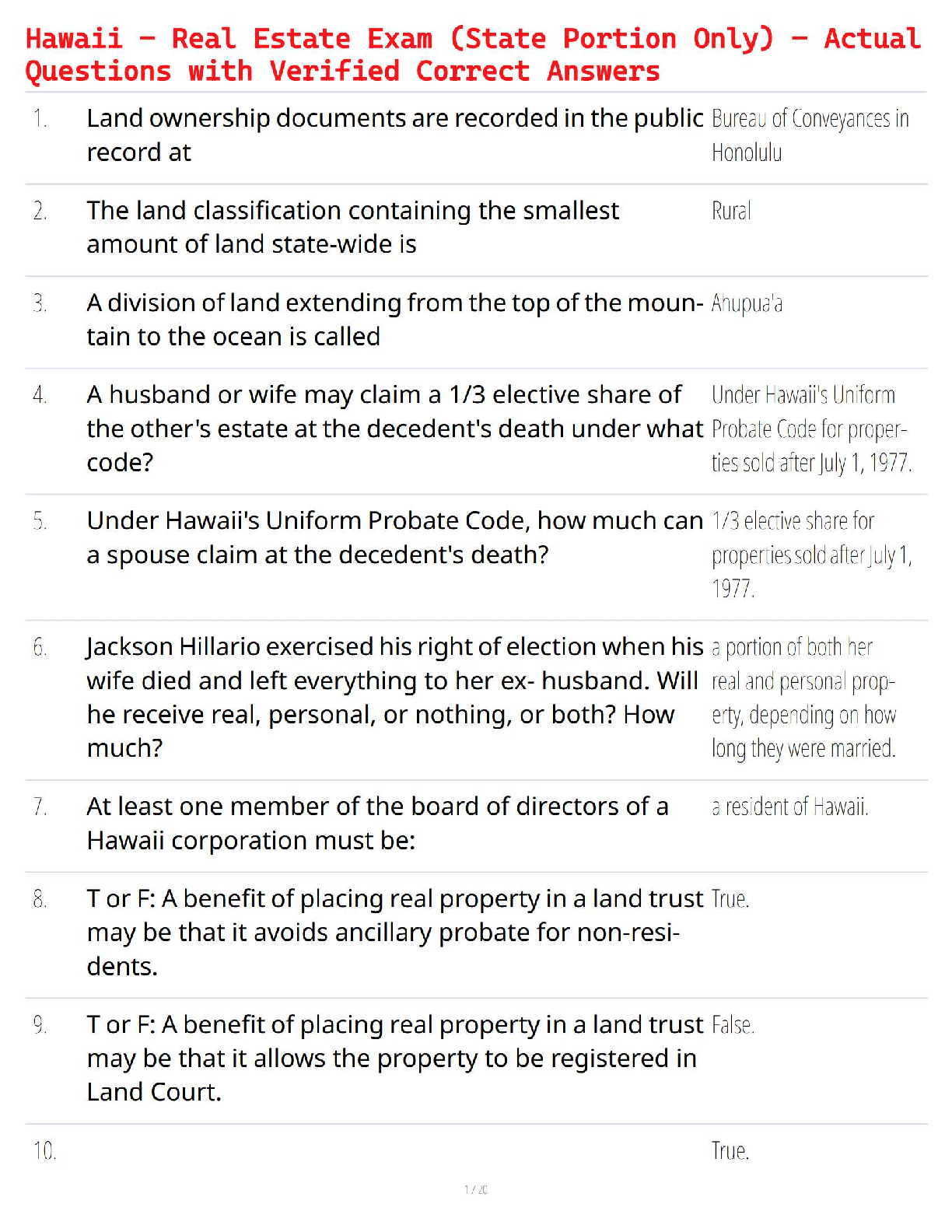 Master the state-specific portion of the Hawaii Real Estate Exam with our comprehensive 2025/2026 test bank. This essential study guide features a complete collection of actual exam questions, each with a verified correct answer. Designed to help you ace the test on your first attempt, this resource covers critical topics like Hawaii's Uniform Probate Code, land classifications, and property laws. Stop worrying about resits and start your real estate career with confidence. Download now for immediate access to the ultimate preparation tool.