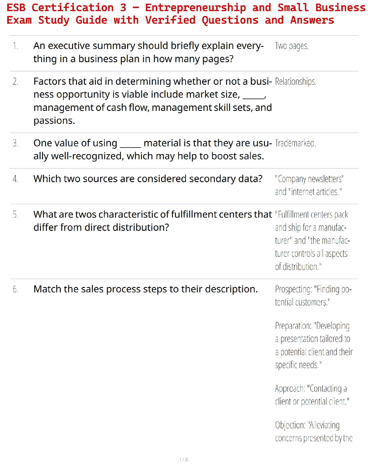 Get ready to ace your Entrepreneurship and Small Business (ESB) v3 Certification exam with our comprehensive test bank. This guide is packed with verified questions and detailed answers, covering all the essential topics you'll face on the actual test. From crafting a business plan and assessing market viability to understanding sales processes and data sources, our resource provides the targeted practice you need. Master the concepts, boost your confidence, and pass your ESB certification on the first try with this essential study tool.