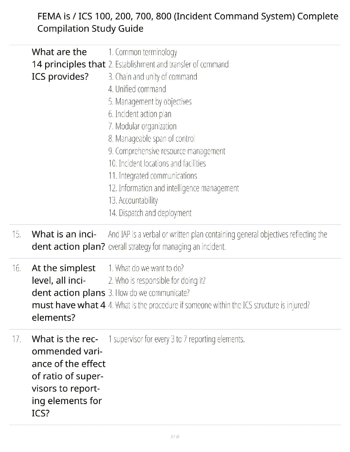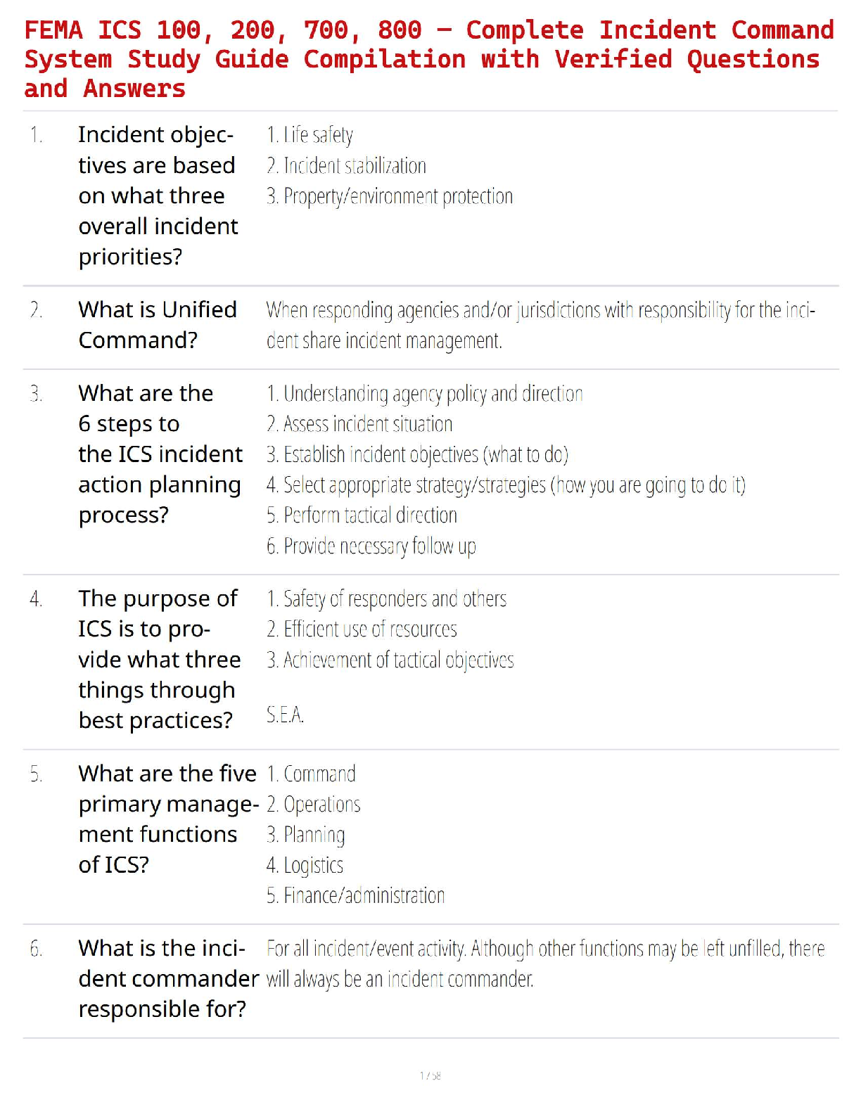 Unlock success and master the FEMA Incident Command System with our complete study guide and test bank for ICS 100, 200, 700, and 800. This all-in-one resource features a comprehensive compilation of verified questions and detailed answers, covering every critical topic you need to know. From understanding the core principles of ICS and Unified Command to navigating the incident action planning process, this guide has you covered. Designed to streamline your study process and boost your confidence, this test bank is your key to passing the FEMA certification exams on your very first attempt.