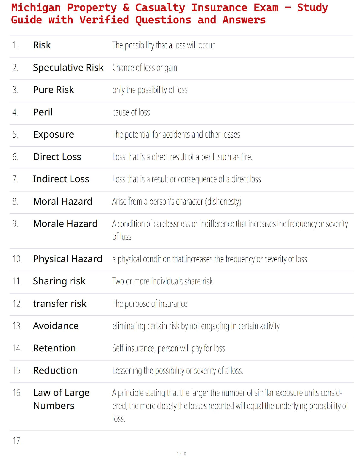 Prepare to ace your Michigan Property & Casualty Insurance licensing exam with our comprehensive study guide for the 2025/2026 testing cycle. This premium resource features a complete test bank of verified questions and expertly crafted answers, covering all essential topics from Risk and Peril to Direct/Indirect Loss and various types of Hazards. Our guide is meticulously designed to simplify complex concepts and ensure you have the knowledge and confidence to pass on your first attempt, avoiding costly resits. Get instant access and start your journey to becoming a licensed insurance professional in Michigan today!