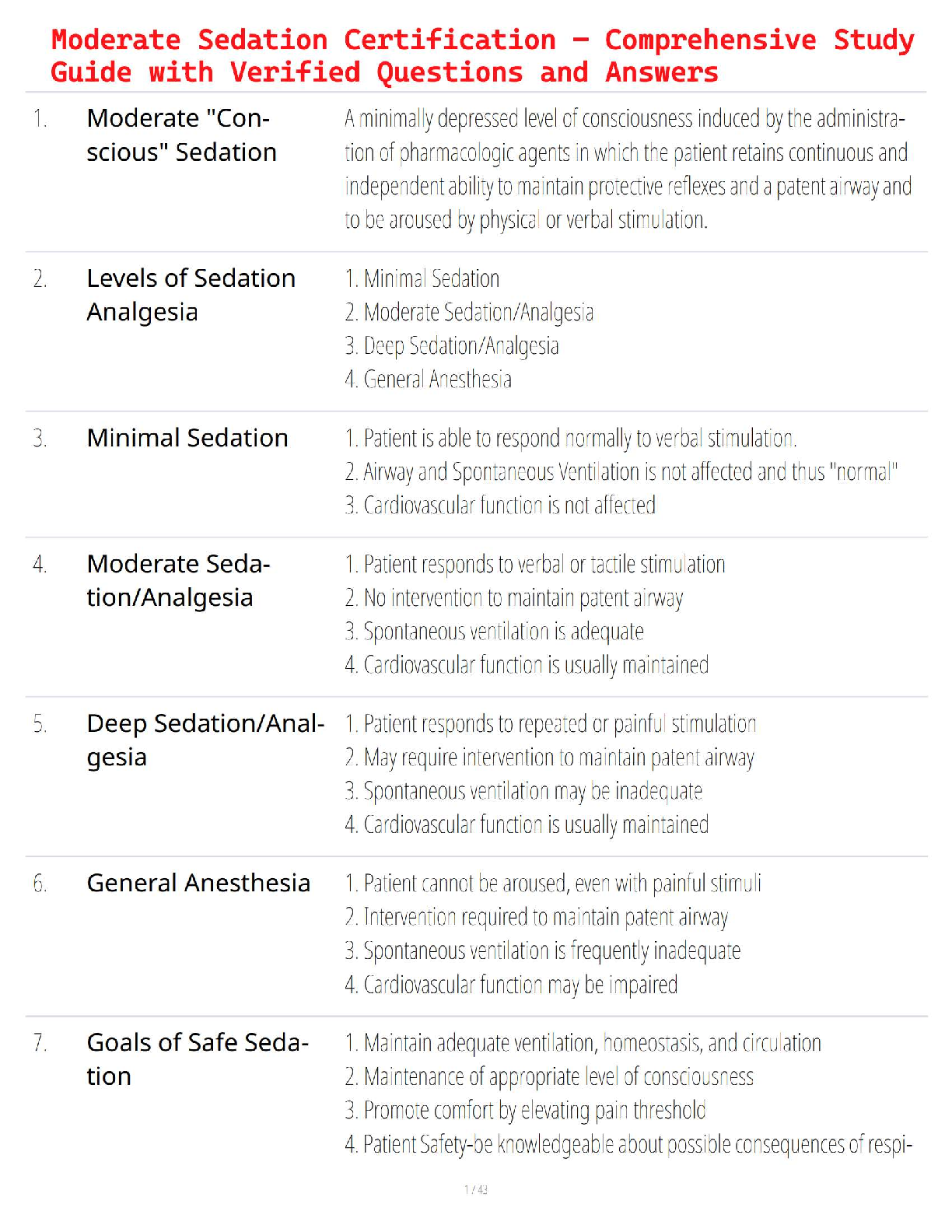 Unlock your success in the Moderate Sedation Certification exam with our newly updated 2025/2026 comprehensive test bank. This guide is expertly crafted to help you master all essential concepts, from the different levels of sedation analgesia to the critical goals of patient safety. Featuring a vast collection of exam-style questions with fully verified answers, this resource is your key to understanding complex topics like minimal, moderate ('conscious'), and deep sedation. Stop worrying about resits! Prepare efficiently, build your confidence, and pass your certification on the very first attempt with this ultimate study companion.
