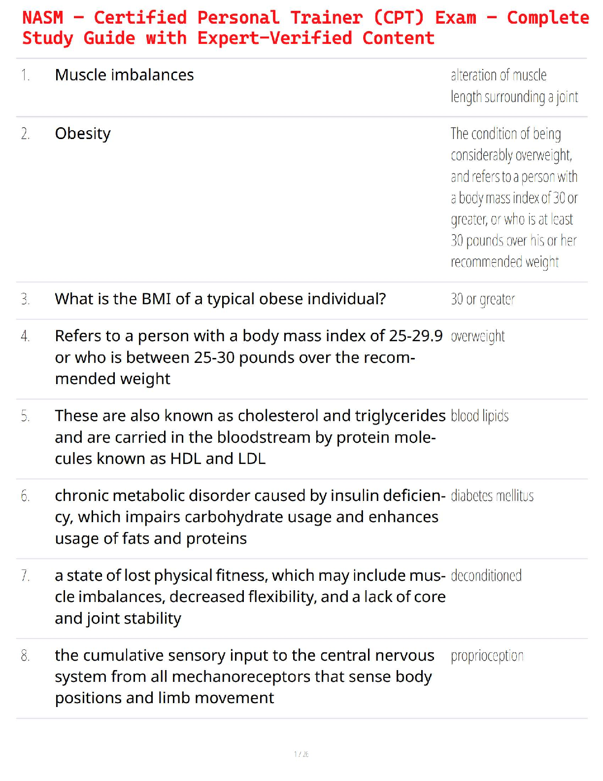 Ace your NASM Certified Personal Trainer (CPT) exam on the very first try! This comprehensive study guide, fully updated for the 2025/2026 academic year, is your ultimate resource for mastering the NASM CPT 7th Edition curriculum. It features an extensive collection of expert-verified questions and detailed answers, covering all critical domains such as Basic and Applied Sciences, Assessment, Program Design, and Nutrition. Break down complex topics like muscle imbalances, BMI calculations, proprioception, and chronic conditions into easy-to-understand concepts. Designed to help you avoid resits, this guide provides the essential knowledge and confidence needed to succeed. Get ready to launch your career in personal training with this indispensable prep tool!