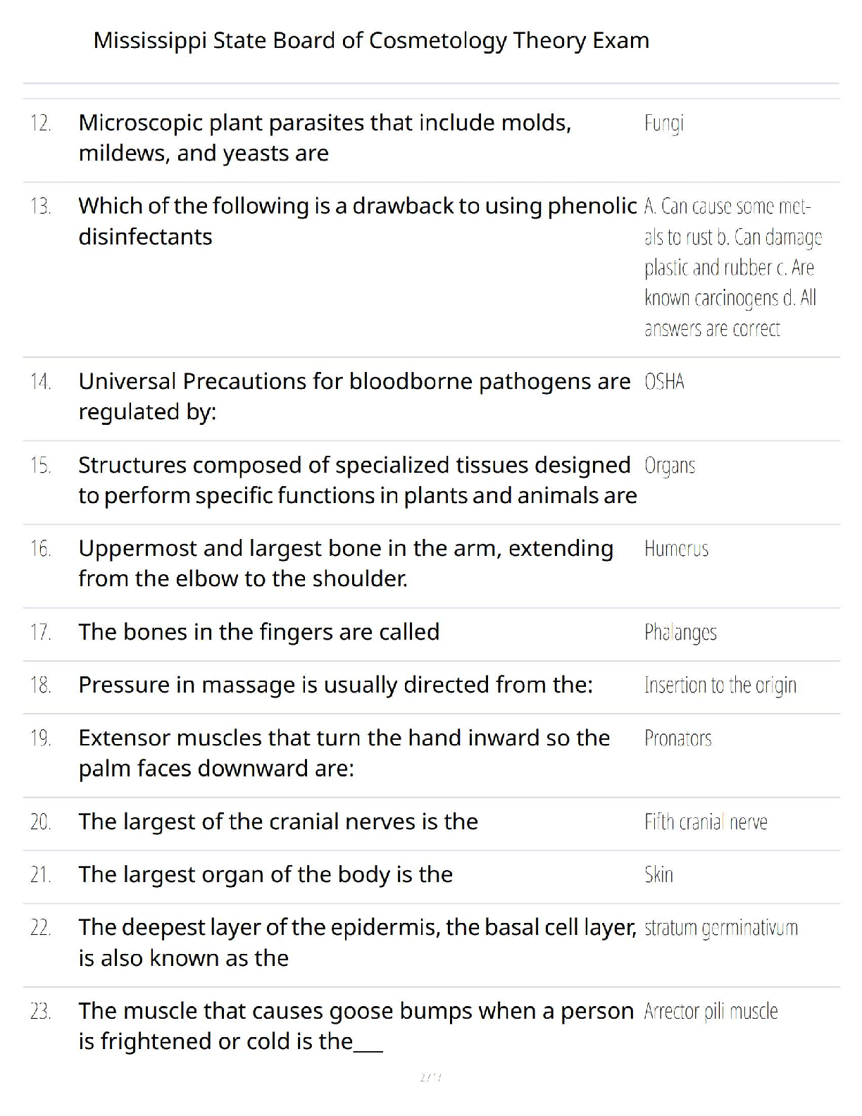 Prepare to ace your Mississippi State Board of Cosmetology Theory Exam with our comprehensive 2024-2025 study guide. This complete test bank features an extensive collection of verified questions and answers, covering every critical topic you'll face on test day. From the fundamentals of sanitation and safety (MSDS) to the history of cosmetology and client relations, this resource is designed to help you pass confidently on your first attempt. Boost your preparation, master the material, and take the final step towards your cosmetology license with this essential exam prep tool.