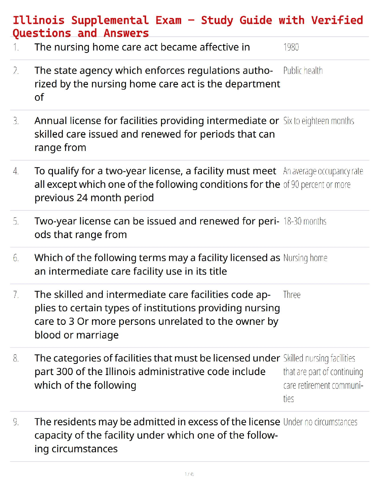 Are you preparing for the Illinois Supplemental Exam? Master the material and pass with confidence using our comprehensive 2025/2026 study guide. This test bank features a complete set of verified questions and detailed answers covering all key areas of the Illinois Nursing Home Care Act and related administrative codes. Our expertly crafted resource is designed to mirror the actual exam, helping you avoid surprises and costly resits. Get instant access to the ultimate preparation tool and ensure your success on the first try!