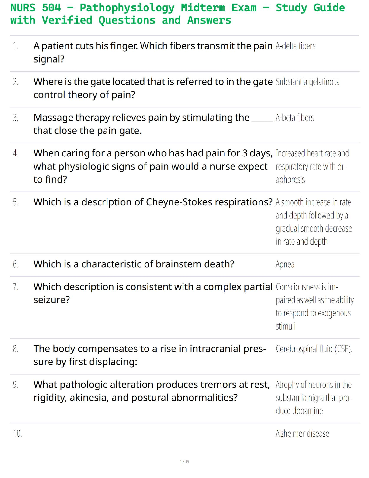 Ace your NURS 504 Pathophysiology Midterm with this comprehensive study guide and test bank! This resource is expertly aligned with McCance and Huether's 'Pathophysiology,' 9th Edition, and features a complete collection of verified questions and detailed answers. Dive deep into crucial topics such as pain transmission, gate control theory, neurologic disorders, respiratory patterns like Cheyne-Stokes, and more. This is the ultimate tool to master complex concepts, test your knowledge, and walk into your exam with confidence. Download now to ensure you pass on your first attempt and avoid resits!