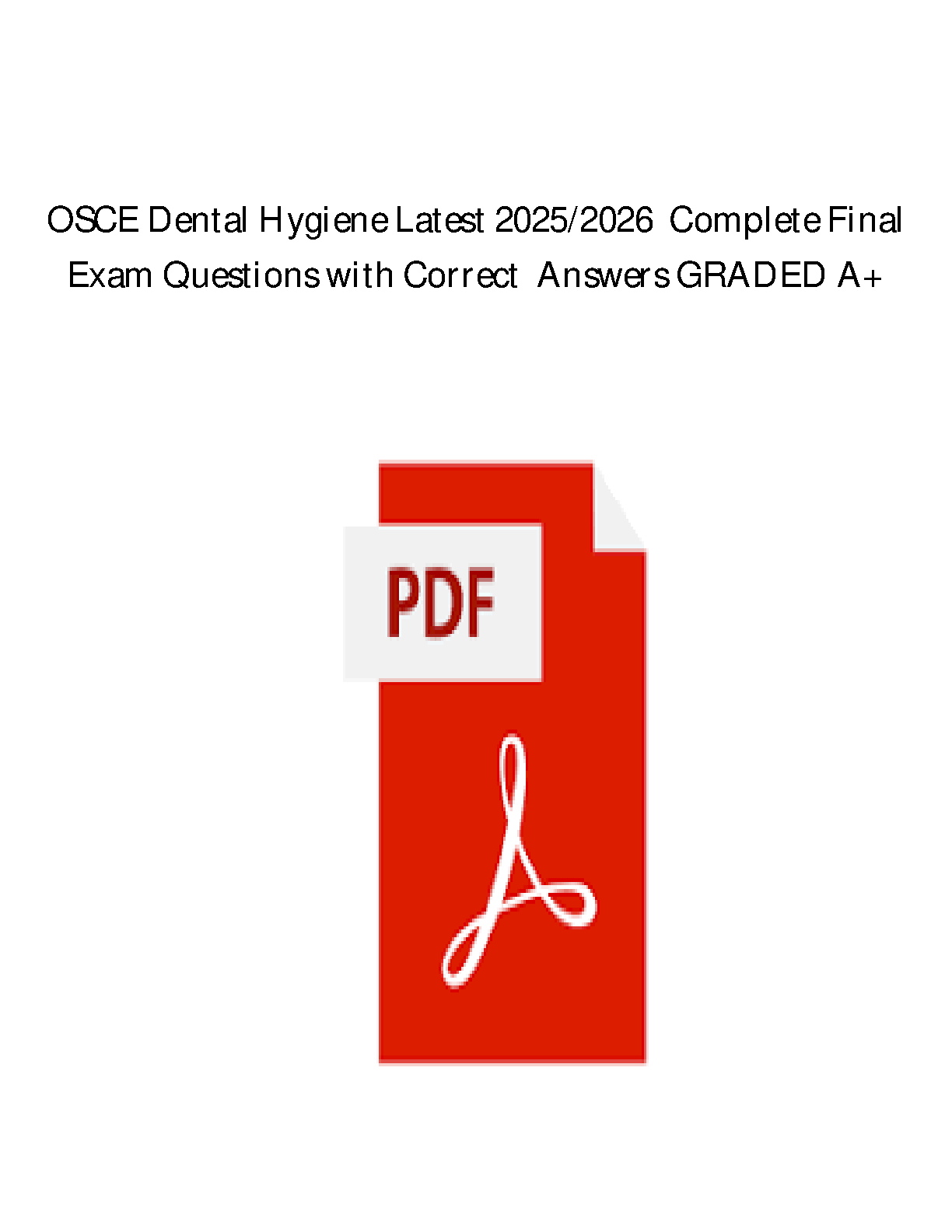 Prepare to excel in your Objective Structured Clinical Examination with our latest 2025/2026 OSCE Dental Hygiene Test Bank. This comprehensive resource is expertly designed to help you pass your final exams on the very first attempt and avoid costly resits. Inside, you'll find a complete collection of final exam questions, each paired with a correct, verified answer. Master the essential concepts, practice with realistic exam scenarios, and build the confidence you need to achieve an A+ grade. Download now and take the most effective step towards acing your dental hygiene OSCE!
