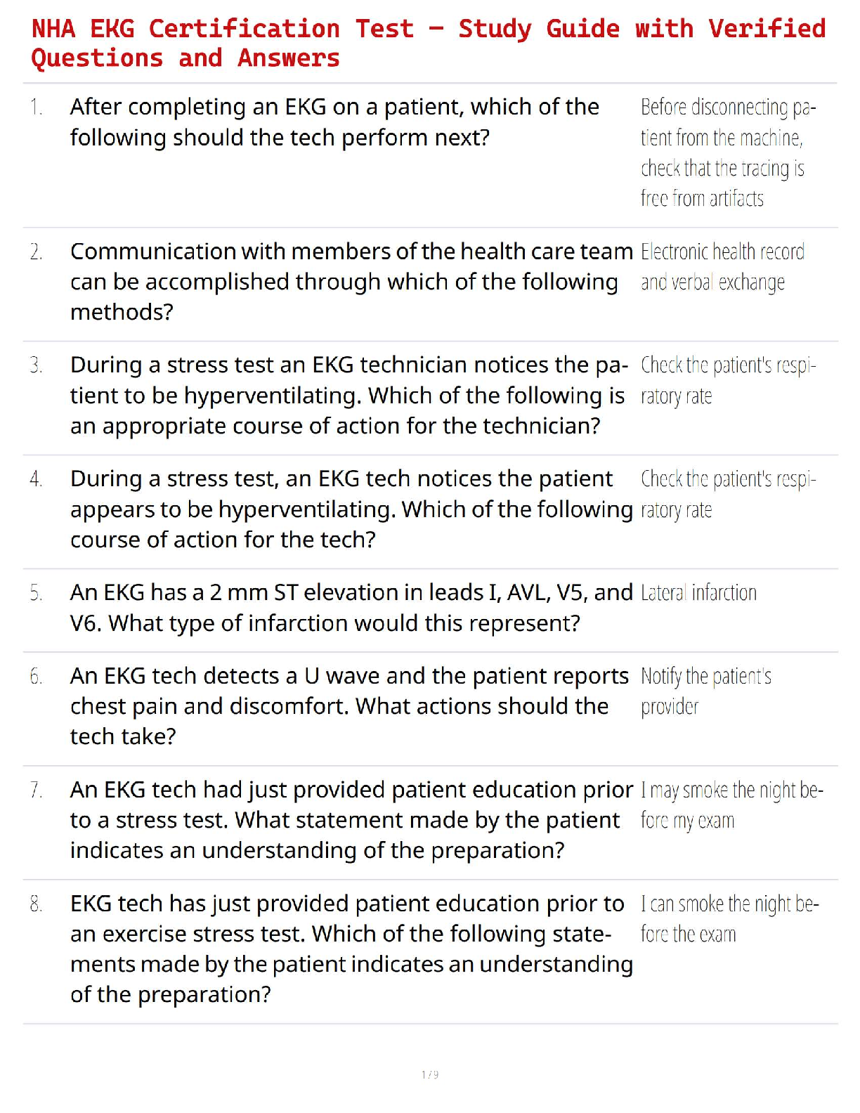 Ace your National Healthcareer Association (NHA) Certified EKG Technician (CET) exam with ease! This comprehensive 2025/2026 study guide is packed with verified questions and detailed, accurate answers, covering all essential topics you'll face on the test. From EKG procedures and patient care during stress tests to interpreting critical findings like ST elevations and U waves, this resource is meticulously designed to help you master the material. Stop worrying about resits and secure your certification on the first attempt with this ultimate exam preparation tool.