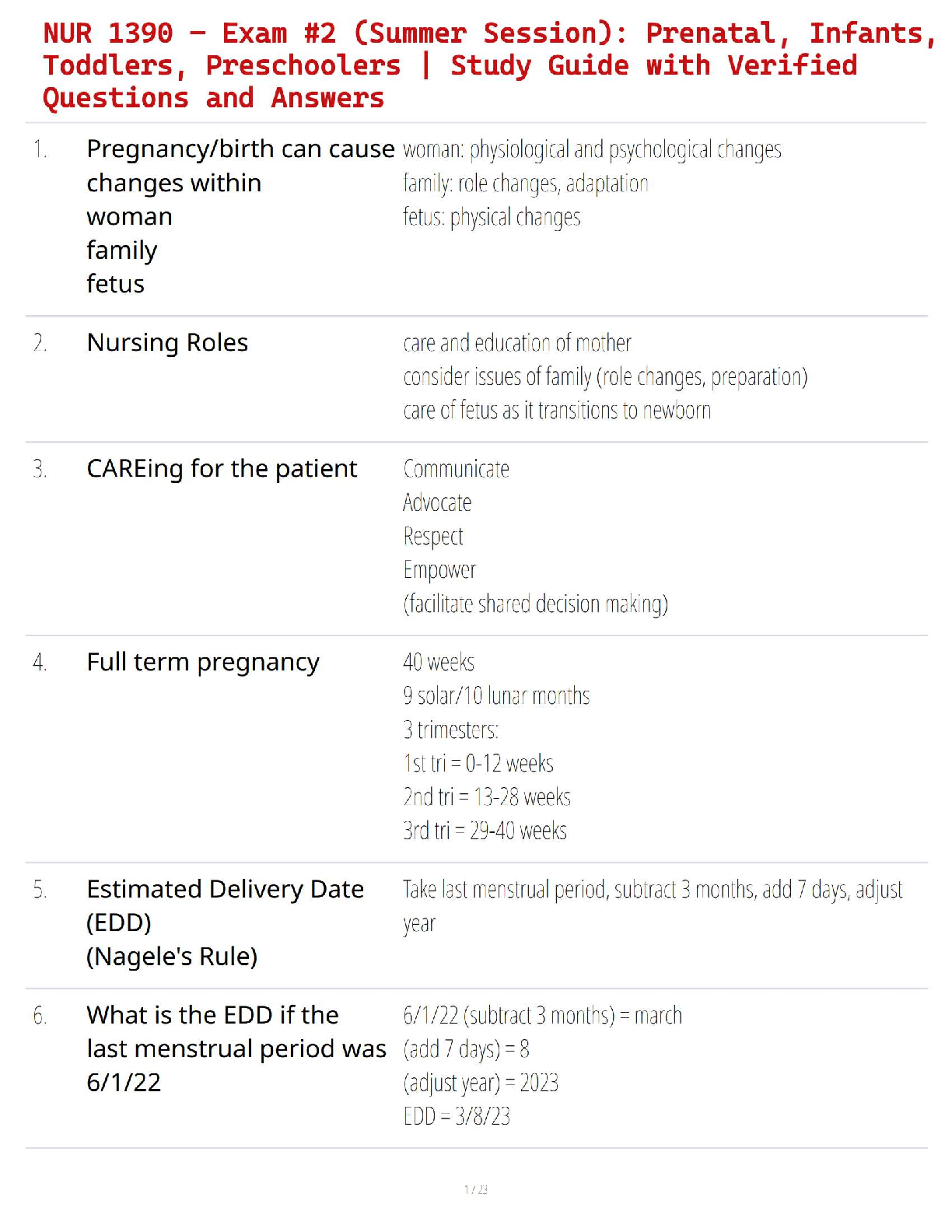 NUR 1390 Exam 2 Study Guide 2025/2026: Verified Questions & Answers for Prenatal and Pediatric Nursing | Ace Your Exam & Avoid Resits
