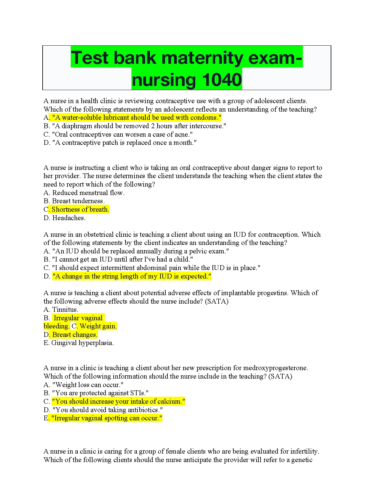 Test Bank Maternity Exam Nursing 1040 LATEST UPDATE FOR 2023/2024