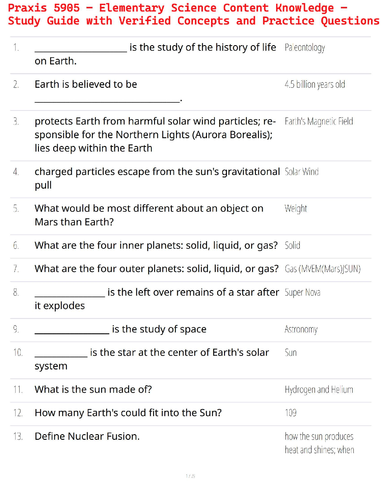 Ace your teacher certification with our comprehensive Test Bank for the Praxis 5905 Elementary Science Content Knowledge exam. This up-to-date 2025/2026 resource is packed with a vast collection of practice questions and meticulously verified answers. Master essential topics from Earth science to astronomy and build the confidence you need to pass on your first attempt. This study guide is your ultimate tool for effective and efficient exam preparation.
