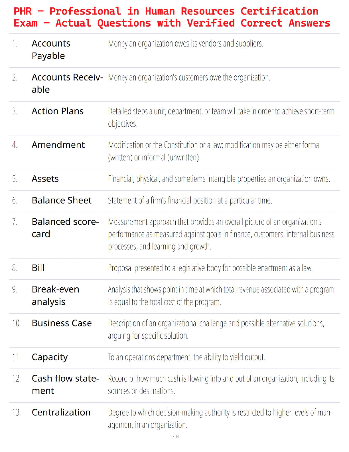 Prepare to pass your Professional in Human Resources (PHR) certification exam with confidence! This comprehensive test bank is your ultimate study tool, featuring a detailed collection of actual exam questions paired with verified, correct answers. This guide covers essential terminology and concepts, from financial principles like 'Accounts Payable' and 'Balance Sheet' to strategic concepts like 'Balanced Scorecard' and 'Business Case'. Master the key knowledge areas and boost your readiness to achieve your PHR certification on your very first attempt. This is the latest resource designed to help you succeed without the need for resits.