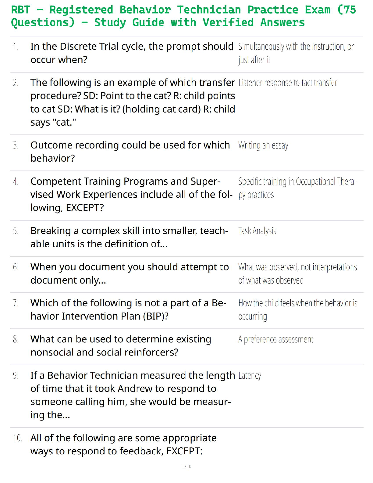 Ace your Registered Behavior Technician (RBT) certification exam with our comprehensive 2025/2026 study guide. This essential resource features a complete test bank of 75 practice questions, each accompanied by a verified, in-depth answer to ensure you master the material. Designed to mirror the actual RBT exam, this guide covers all critical areas of the RBT Task List, including measurement, assessment, skill acquisition, behavior reduction, documentation, and professional conduct. Stop worrying about resits and start studying smarter. Our targeted practice exam is the ultimate tool to build your confidence and help you pass on your very first try.