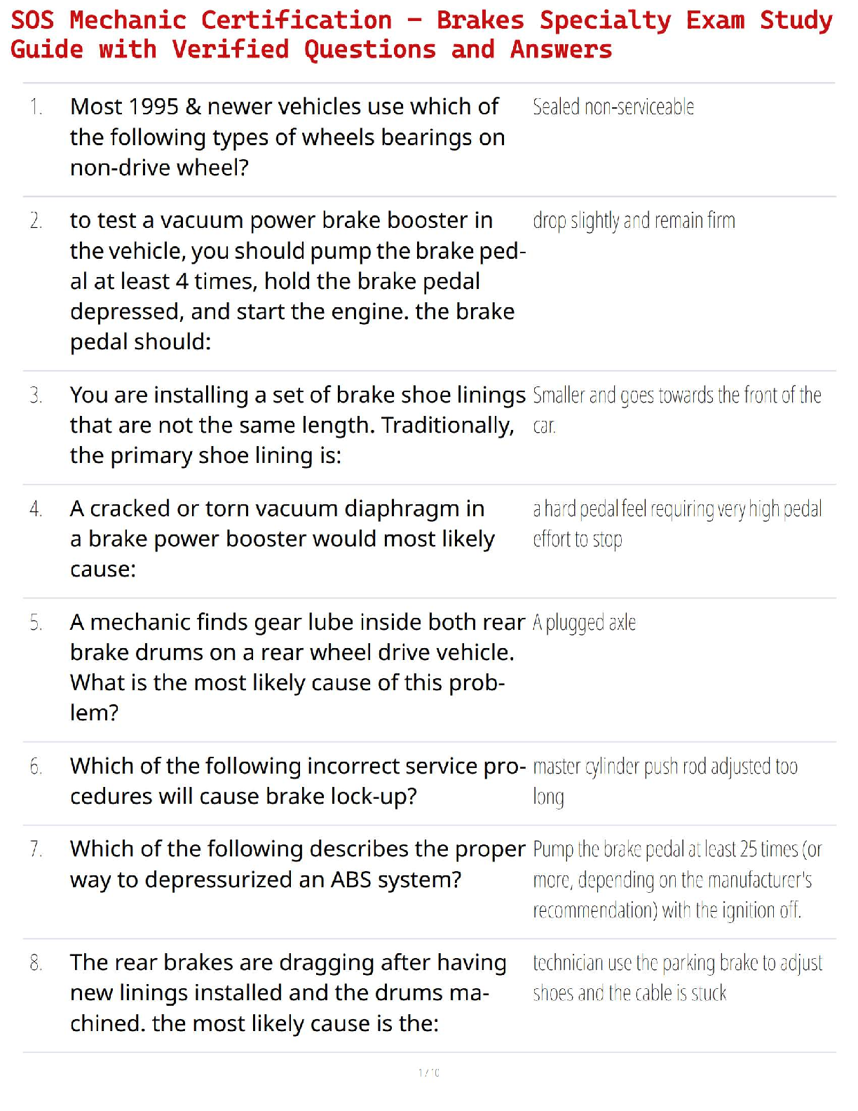 Ace your SOS Mechanic Certification with this comprehensive test bank for the Brakes Specialty Exam. This study guide features a complete collection of verified questions and their correct answers, meticulously compiled to cover all essential topics. Prepare effectively by mastering concepts such as vacuum power brake boosters, ABS systems, brake shoe installation, and troubleshooting common issues like brake dragging and lock-ups. Get the confidence you need to pass your certification exam on the first try.