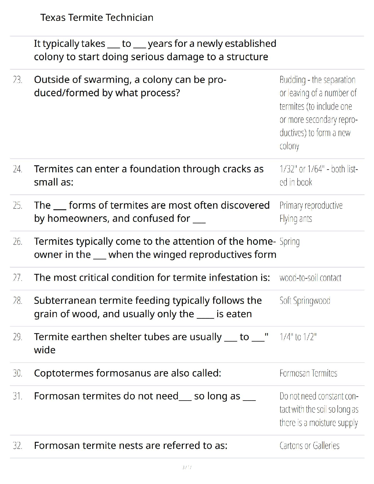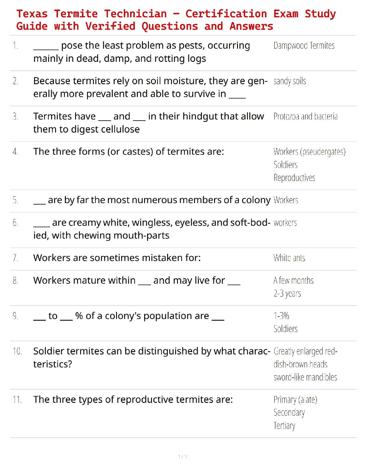 Ace your Texas Termite Technician Certification Exam with our newly updated 2025/2026 study guide. This essential resource provides a complete set of verified questions and accurate answers, covering all key areas of termite biology, identification, and control. Designed for aspiring pest control professionals, this guide is your ultimate tool to study effectively, build confidence, and secure your certification on the first try. Say goodbye to exam anxiety and hello to your new career!