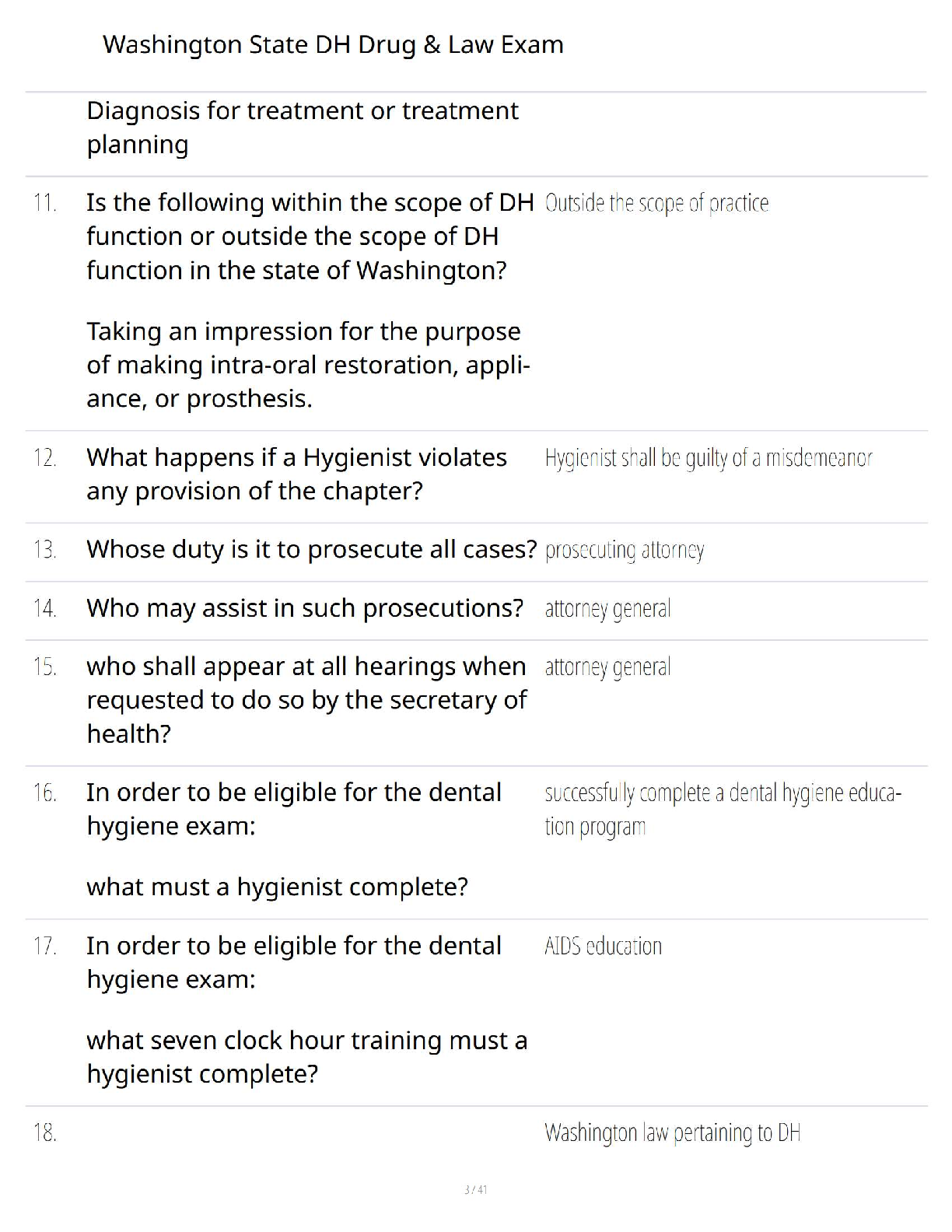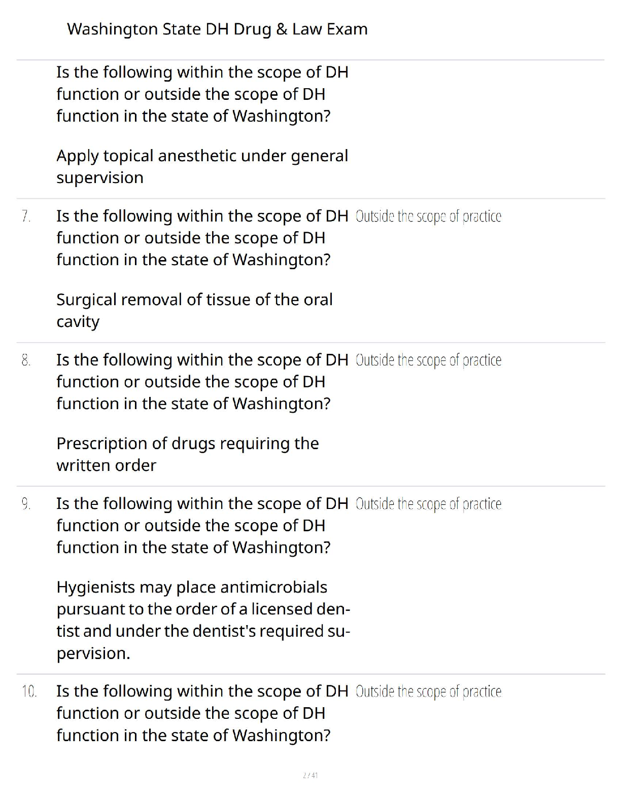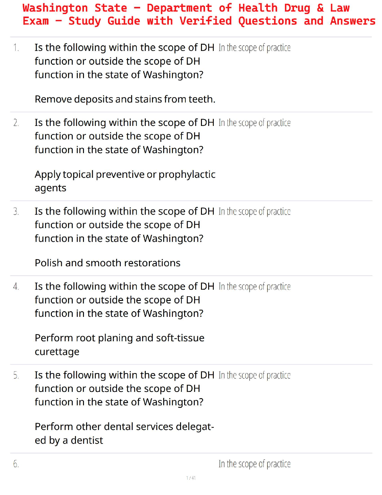 Ace your Washington State Department of Health Drug & Law Exam for Dental Hygienists with our comprehensive test bank. This study guide features a complete collection of verified questions and detailed answers, covering all essential topics on the scope of practice, regulations, and legal responsibilities for DH professionals in Washington. Prepare effectively, understand key concepts, and pass your licensing exam with confidence. This Q&A resource is your ultimate tool for success.